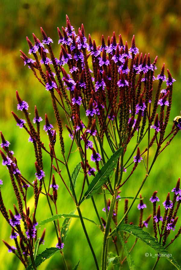 Vervain (Swamp Verbena) The beautiful native Blue Vervain is common in our area. It prefers full to partial sunlight and moist soil or wet muck. Habitats include moist meadows, soggy thickets, marshes and borders of rivers and ponds. It is a slender, erect, square-stemmed branching perennial, up to 5' tall, with opposite, conspicuously veined, toothed, lance-shaped leaves up to 6" long and 1" across. The upper stems terminate in panicles of flowering spikes up to 1' long and 6" across. Individual floral spikes are up to 5" long and densely crowded with ascending rings of tubular, 5-lobed blue-violet blossoms up to ¼" long.