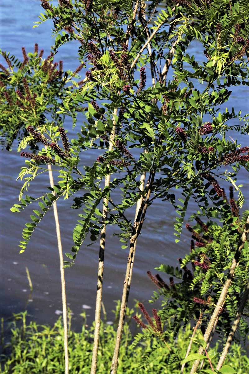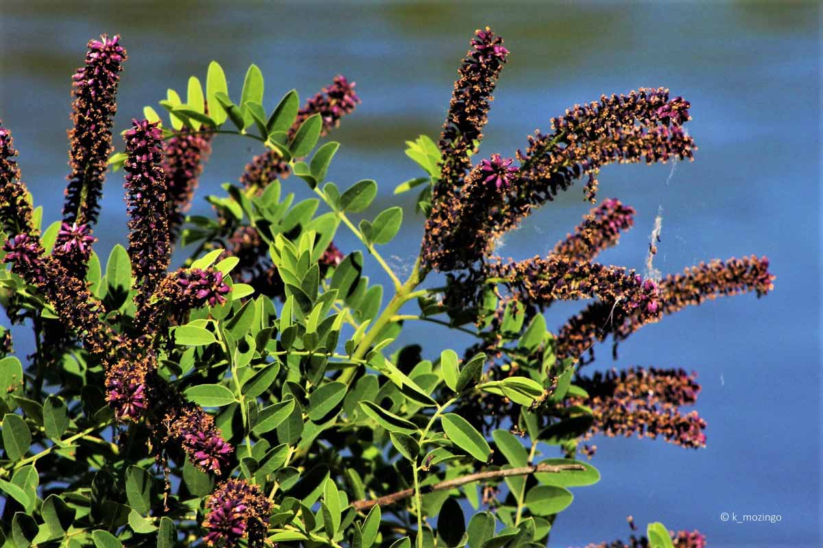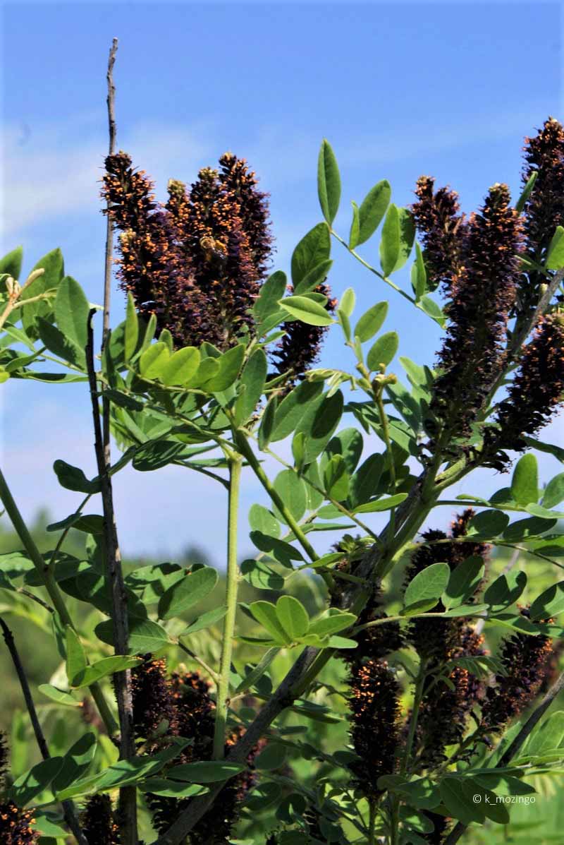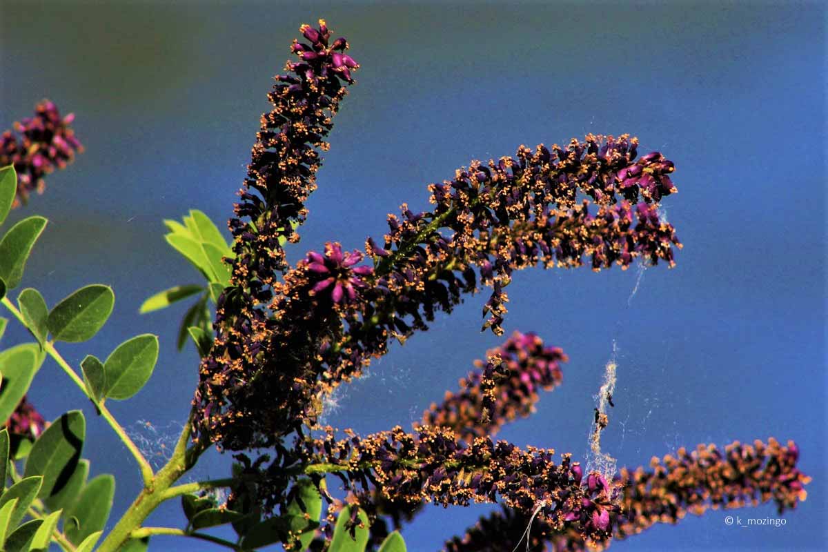 (False Indigo) The native Indigo Bush is uncommon in our area. It prefers full or partial sun and wet to moist conditions, usually on shorelines. It is a shrub about 4-12' tall that branches occasionally. The light gray-green alternate leaves are about ½–1½' long and odd-pinnate with 11-35 leaflets with petioles up to 2" long. Individual leaflets are 1-2" long and ½–1" across with a tiny pointed tip. Clusters of 1-6 spike-like racemes of flowers develop from the upper branches. Individual racemes are 3-8" long and cylindrical in shape densely formed by purple flowers that are about ¼" long and tubular in shape.
