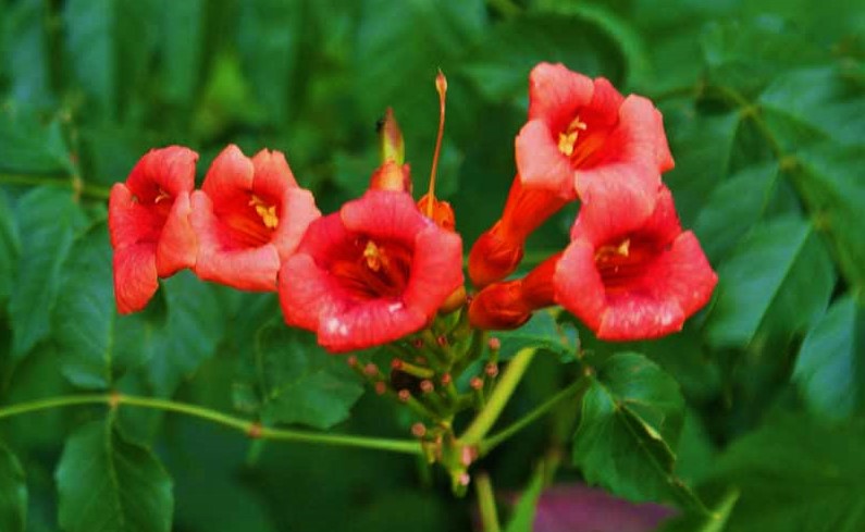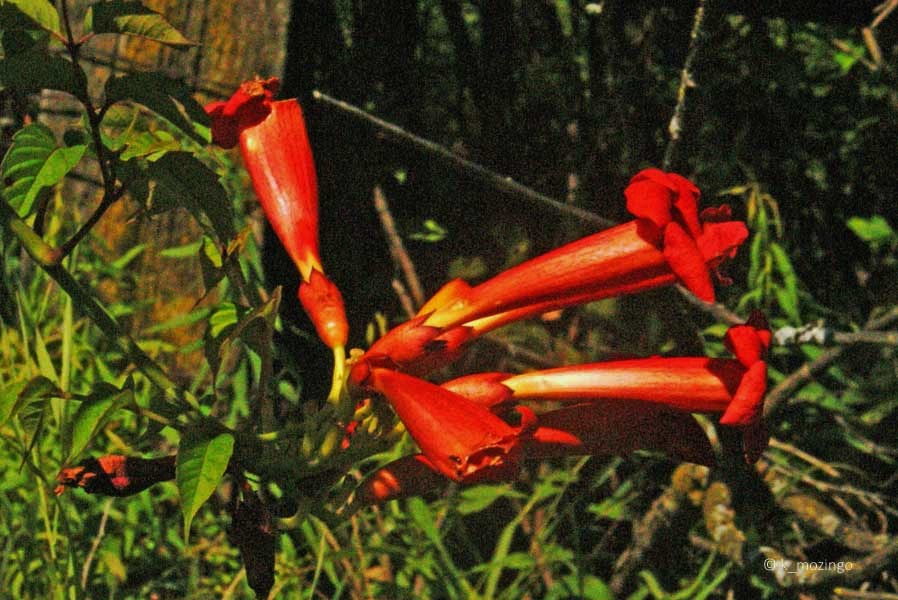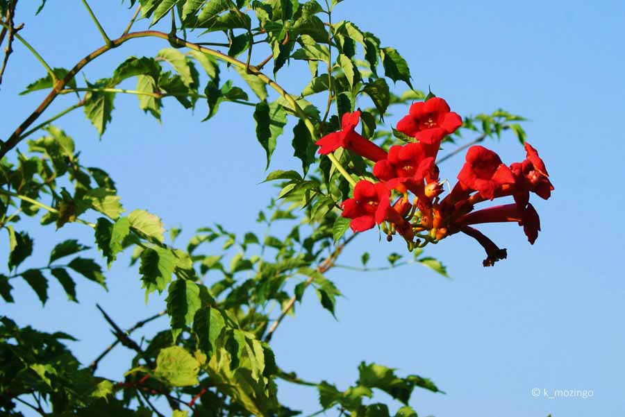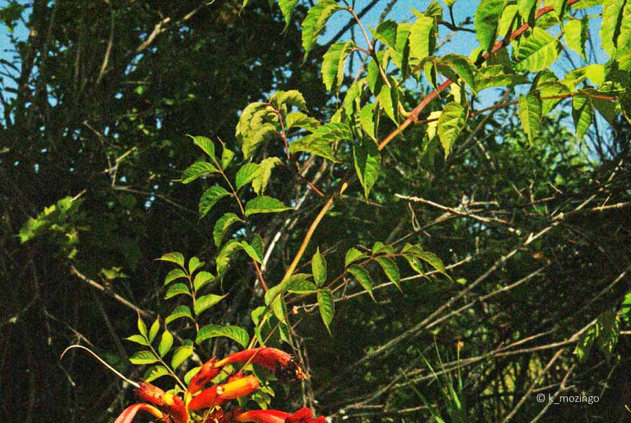Creeper (Trumpet Vine) The non-native Trumpet Creeper is uncommon in our area. It prefers partial to full sun and medium-moist soils. Habitats include open woodlands, woodland edges, riverbanks, and roadsides. This perennial woody vine, up to 40' long, branches occasionally and usually climbs up trees, utility poles and other vertical structures. Pairs of opposite compound leaves occur along the length of the vine that are odd pinnate, with 7-11 coarsely toothed leaflets that are up to 3" long and 1" across. Short cymes of 2-8 flowers occur along the vine. The reddish-orange flowers are up to 3½" long and "trumpet-like" in appearance. Trumpet Creeper along Minkler Road August 14, 2012 Trumpet Creeper along Minkler Road July 31, 2015 Trumpet Creeper along Minkler Road July 4, 2012 Trumpet Creeper foliage along Minkler Road July 31, 2015 Click here for more information. Copyright © 2011-2017 by Kendall County Forest Preserve District. All Rights Reserved. |