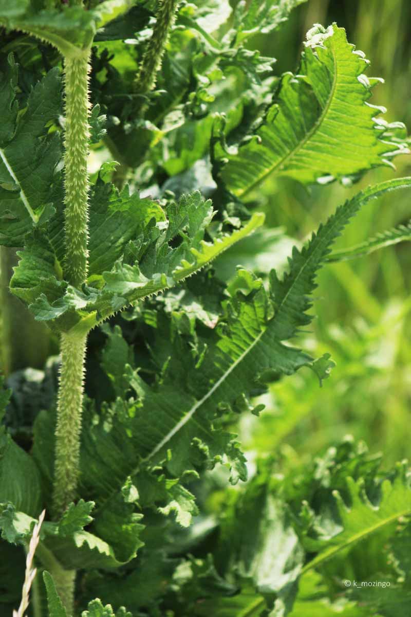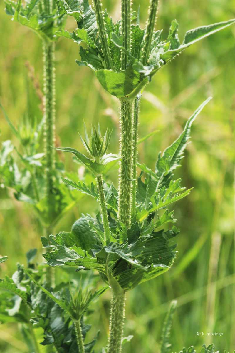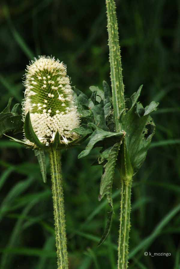 Teasel) The non-native (European) Teasel is common (unfortunately) in our area. It is an invasive that is found along busy highways where seeds have been scattered by vehicles and it keeps trying to move in to our natural areas. It is a biennial with a low rosette of basal leaves, up to 12" long and 3" across, in the 1st year. In the 2nd year, it develops stems up to 6' tall with crinkly lance-shaped untoothed opposite leaves up to 12" long and 3" across. The tall flowering stalk terminates in a stout spike of flowers up to 4" long and 1½" across with several linear bracts up to 6" long curving up around the spike. The narrow ½" long tubular flowers are pale lavender or white and densely crowded together all around the spike giving it a pincushion-like appearance after the flowers have withered away.