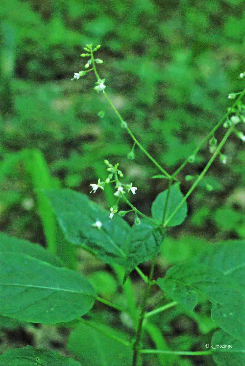 (Broadleaf Enchanter's Nightshade) The native Enchanter's Nightshade is common in our area. It prefers dappled sunlight to medium shade and a slightly moist rich loamy soil. This perennial is ¾-2' tall and unbranched or little branched. The opposite leaves are up to 5" long and 3" across. The central stem terminates in a raceme of flowers up to 6" long. Each flower has 2 white petals, 2 green sepals, 2 stamens, and a slender style. The flowers later develop small burs.