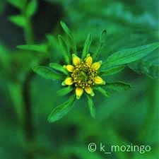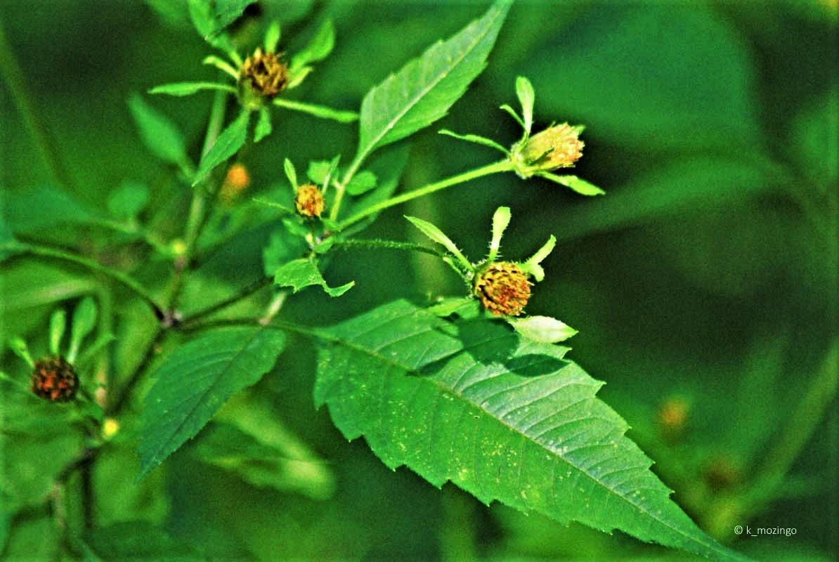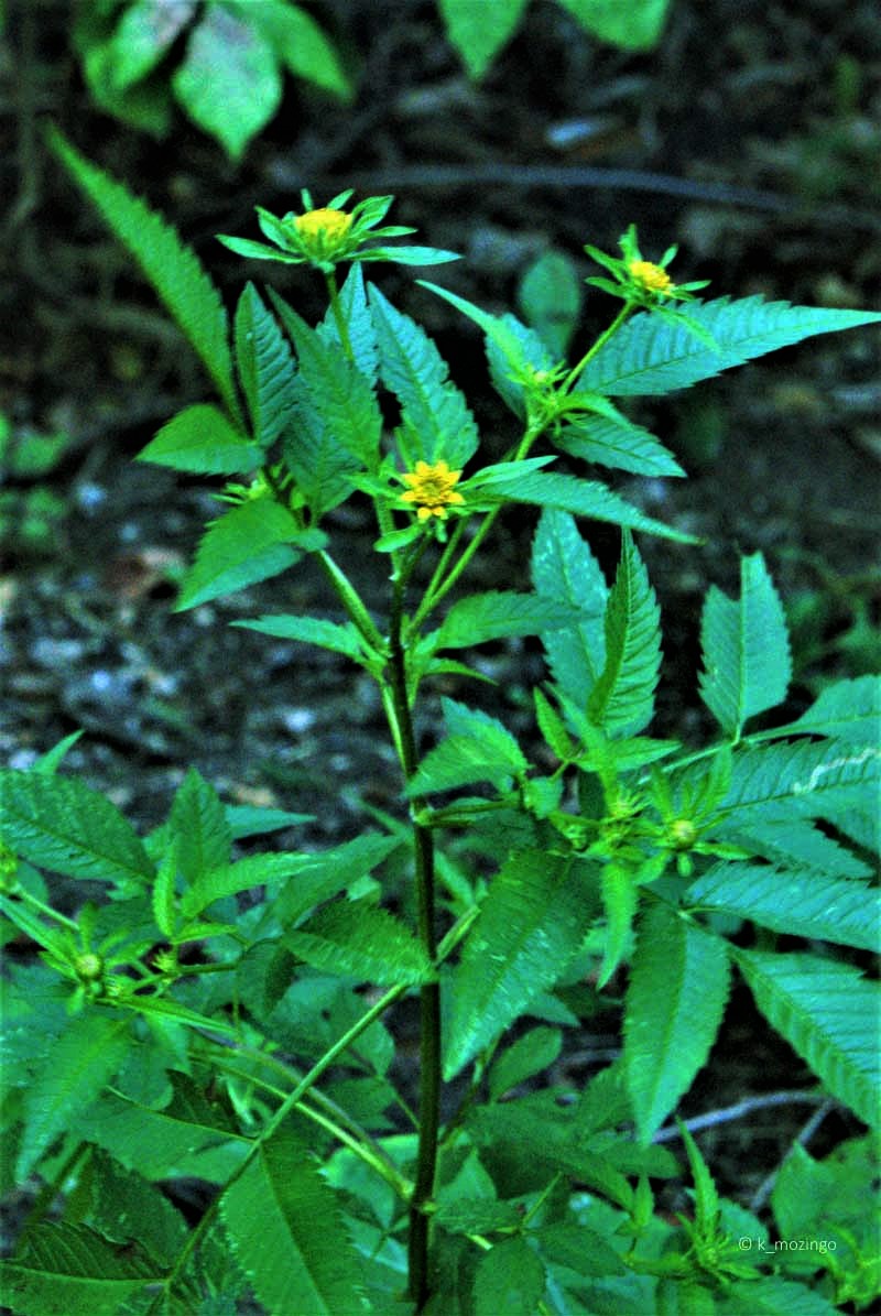 (Big Devil's Beggarticks) The native Tall Beggar's Ticks is uncommon in our area. It prefers full sun to light shade, moist conditions and soil with sufficient organic material to retain moisture. Habitats include openings in moist woodlands, woodland borders, thickets and meadows in floodplain areas, marshes and seasonal wetlands. This annual is 2-3½' tall, branching occasionally in the upper half. The compound leaves are usually odd-pinnate, consisting of 3 or 5 leaflets. The leaflets are up to 3" long and 1" across, lance-shaped, coarsely toothed, with rather long and pointed tips. Some of the upper stems terminate in individual flowers ¾–1" across on long stalks; some stalks may have 1-2 additional flowers smaller in size. The flowers have numerous disk florets that have dull yellow corollas with bases surrounded by 11-20 green leafy bracts. The brown seed heads have 2-pronged burs with tiny barbs pointing downward.