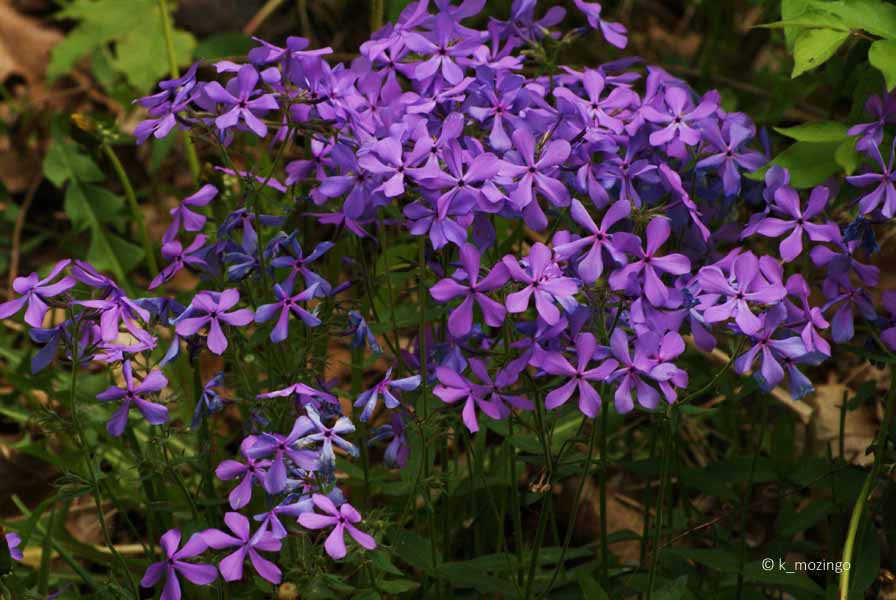 (Woodland Phlox) The beautiful native Blue Phlox is common in our area. It prefers light shade to partial sun and moist to slightly dry rich loamy soil in deciduous woodlands and areas along woodland paths. This spring perennial's fertile shoots are about 1–1½' tall and unbranched, except near the apex where the flowers occur. The opposite lance-shaped leaves are up to 2½" long and ¾" across. Each fertile shoot terminates in a cluster of flowers spanning 2-3½" across. Each light blue-violet or lavender flower is about 1" across and has 5 spreading petals that are fused together at its tubular base.