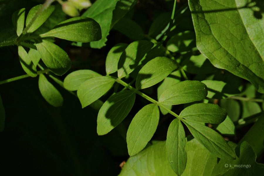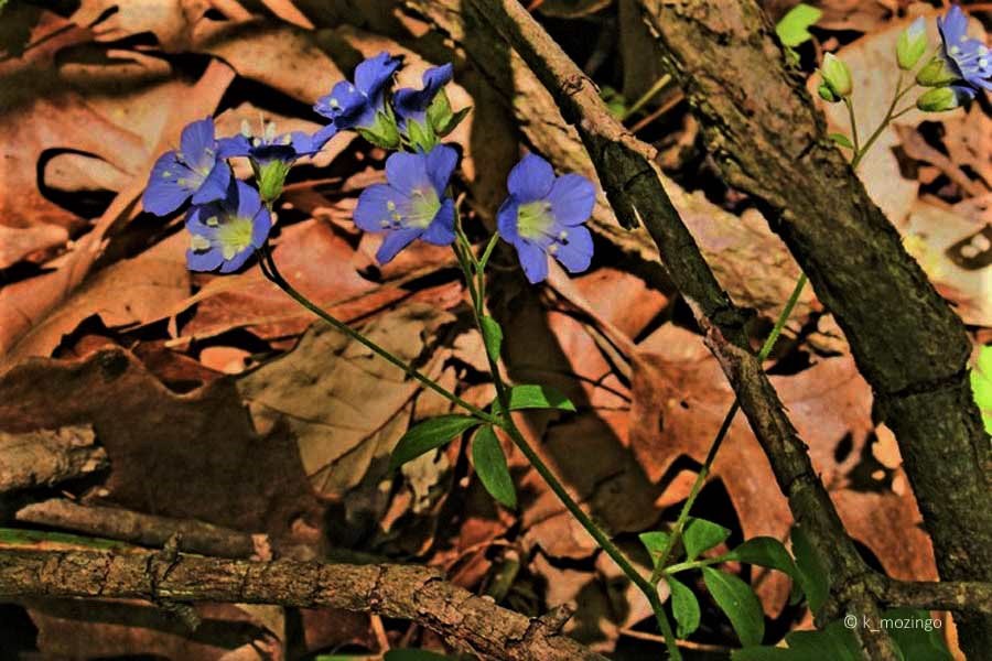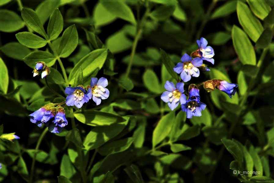 (Greek Valerian) The lovely native Jacob's Ladder is common in our area. It prefers light shade or dappled sun and slightly moist loamy soil. Habitats include deciduous woodlands, lower wooded slopes, and shaded banks of streams. This perennial is ½–1½' tall with leafy stems, somewhat angular and having a tendency to lean or sprawl. The alternate compound leaves are simple odd-pinnate and up to 8" long, consisting of about 5-15 opposing leaflets ¾-1¼" long, untoothed and elliptic-shaped. The upper stems terminate in loose panicles of floppy or nodding flowers, each about 2/3" across and bell-shaped with 5 light blue-violet rounded petals.