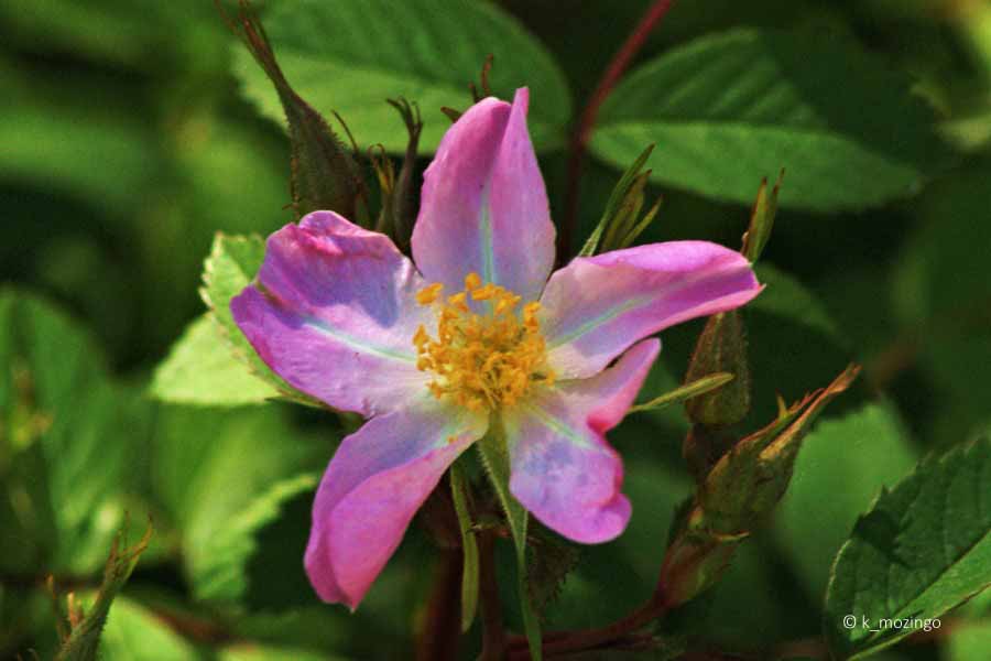 (Prairie Rose) The native Sunshine Rose is uncommon in our area, but might be found in prairie remnants. It is similar to Pasture Rose but differs in size (it is only 1-2' tall) and its lack of glandular hair on the blossom and hip stems. It prefers full to partial sun and average to dry moisture. Its alternate compound leaves have 9 - 11 leaflets. Each oval-shaped toothed leaflet is about 1" long and 5/8"' wide. 1 to 4 flowers typically form on smooth pedicels at the tips of new (1st-year) shoots. They are 1½ -2" across with 5 broad, rounded petals that are light to deep rose pink.