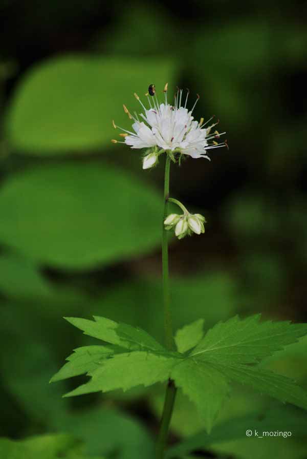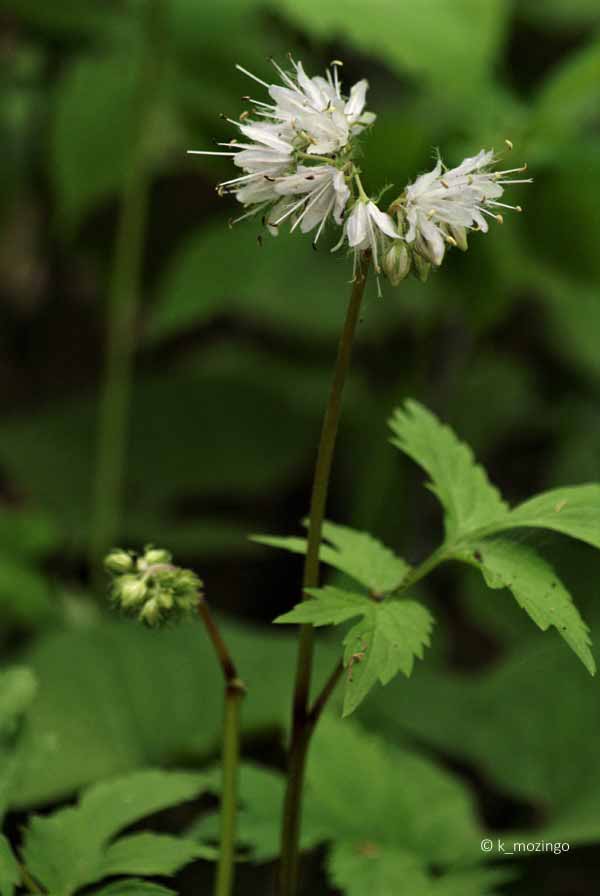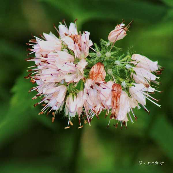 (Eastern Waterleaf) The lovely native Virginia Waterleaf is common in our area. It prefers rich deciduous woodlands, savannas and woodland openings with light shade and slightly moist rich loamy soil. This perennial is a beautiful spring flower, 1-2' tall, with compound leaves having 3-5 coarsely toothed green leaflets with variegated "water spots" and a deeply 3-lobed terminal leaflet. The stalks terminate in dense cymes of flowers about 1-2" across with about 8-20 flowers. Each flower is about 1/2" long with a 5-lobed corolla, a hairy green calyx with 5 linear teeth, 5 protruding stamens, and a slender white style divided at its tip. The corolla is light blue to lavender to almost white with oblong lobes spreading apart just slightly when the flower is fully open.