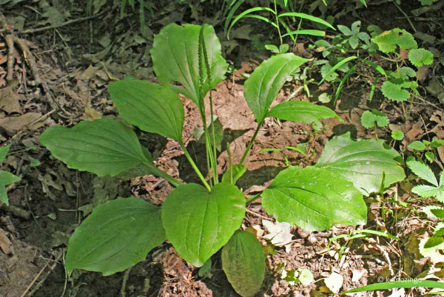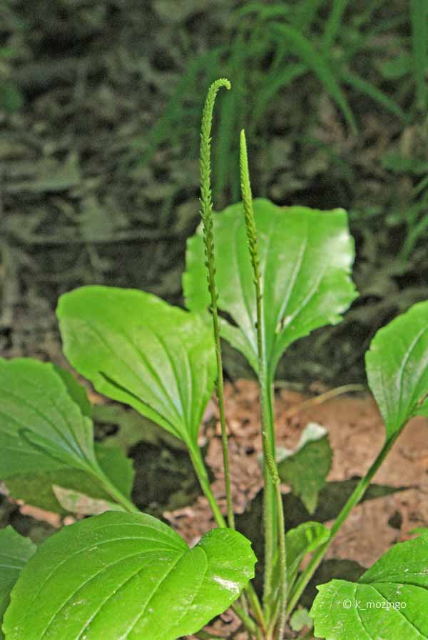 Plantain (Broadleaf Plantain) The non-native (Eurasia) Common Plantain is common in our area. This weed prefers full or partial sun and moist to slightly moist soil. Habitats include lawns, mowed roadsides, compacted soil along paths and waste areas. This perennial has a low rosette of basal leaves about 5-12" across, from which one or more flowering stalks develop. The basal leaves are 2-5" long and 1½–3" across, oval-shaped and toothless with about 5 prominent parallel veins. The flowering stalks are 4-20" long. A narrowly cylindrical spike of densely distributed tiny greenish flowers occurs along the upper two-thirds of the stalk.