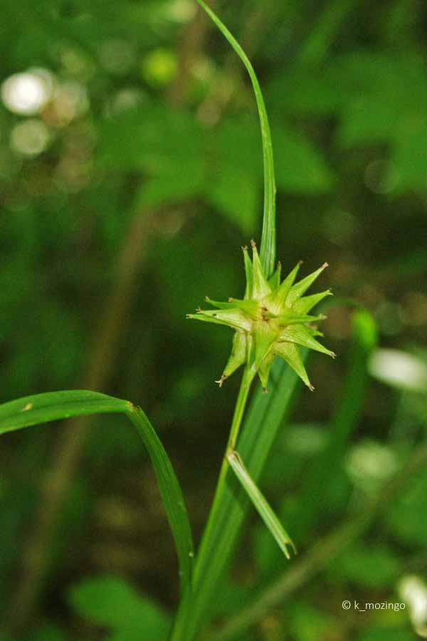 (Common Bur Sedge) The native Gray's Sedge is uncommon in our area. It is a perennial sedge, 2–2½' tall, and prefers partial sun to medium shade and soil containing loam or silt in swamps and shaded areas along streams and seeps. This sedge has a loose tuft of leaves and culms (stems), or it may develop as a solitary leafy culm. Each culm is light green 3-angled and unbranched with several alternate leaves along its length up to 14" long and 3/8" across. Each culm terminates in 1 or 2 green pistilate spikelets and a single stamenate spikelet. Each pistillate spikelet is about 1–1½" across with a spiky appearance.