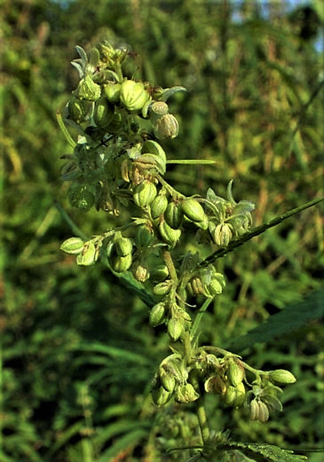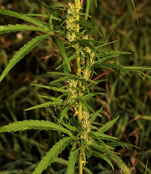 (Marijuana) For completeness, we are including this entry for Cannabis sativa although we are not aware of any growing wild in Kendall County. It is native to central Asia and was initially brought to the U.S. for agricultural purposes and is on the Illinois Noxious Weeds List. This annual is about 3-9' tall, unbranched or little branched, with a stout central stem. The lower leaves are often opposite, while the upper leaves are alternate. On large plants, these leaves can span up to 10" long and across. They are palmately compound with 3-9 leaflets. Each leaflet is narrowly ovate and coarsely toothed. Hemp is dioecious with both male and female plants. The male plants produce both axillary and terminal panicles )up to 1' long) of male flowers. Each male flower is about 1/8" across with 5 sepals, 5 stamens with large anthers, and no petals. The female plants produce short axillary spikes (about 1" long) of female flowers, each about 1/8" long with a single sepal, an ovary with two styles, and no petals. The sepal wraps around the ovary, forming a beak; the 2 styles are exerted from the beak.