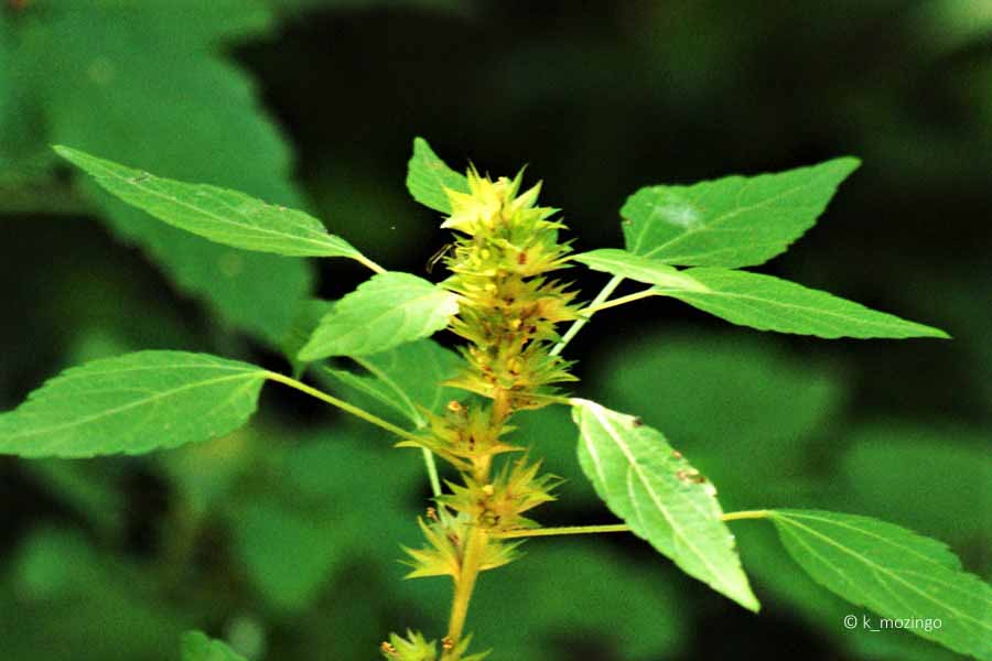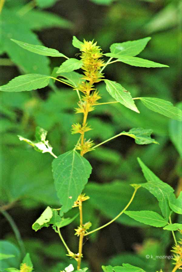 (Rhomboid Mercury) The native Three-Seeded Mercury is common in our area. It prefers light shade to full sun and moist to slightly dry fertile loamy soil. Habitats include disturbed areas of moist prairies, seeps and stream banks. This annual is ½–2' tall, usually unbranched with a central stem having lines of fine white hairs. The alternate leaves are up to 3½" long and 1" across and bluntly toothed with conspicuous pinnate venation. Where the petiole of each leaf meets the stem, there is a conspicuous bract that wraps around the inflorescence consisting of a green cyathium with tiny staminate and pistillate flowers without sepals and petals.