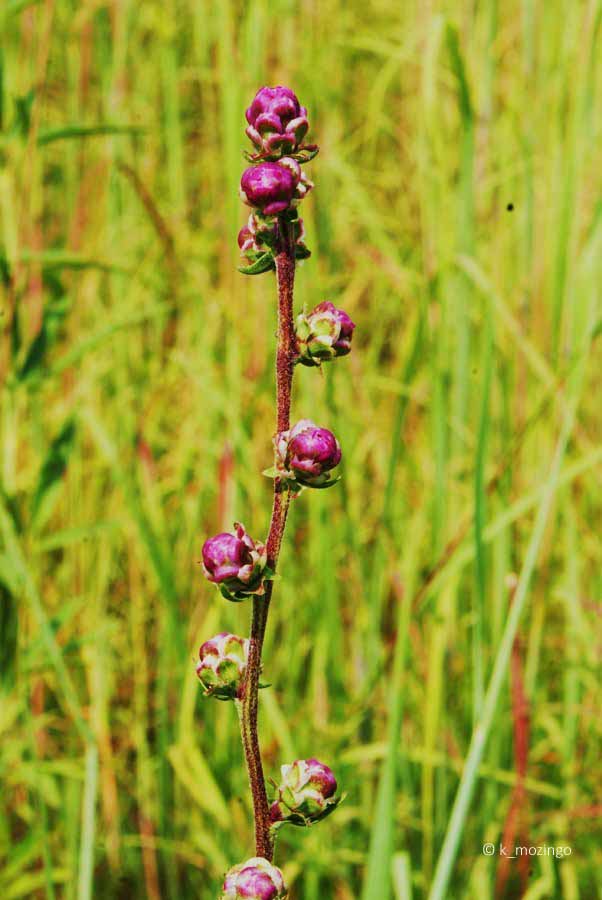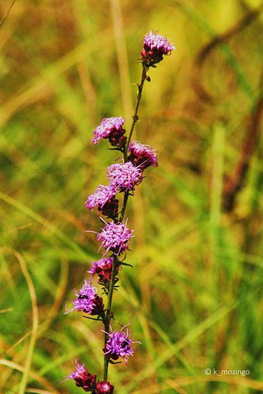 (Tall Blazing Star) The wonderful native Rough Blazing Star is uncommon in our area. It prefers full sun and moderate-moist to dry black soil prairies and dry prairie remnants. It is a stiff, erect, perennial, 1-4' tall, with open spikes of button-like purple-pink blossoms about 1" across that begin to bloom at the top of the flowering spike and gradually bloom downward as the season progresses. Each flower has 5 petals that spread outward from the corolla tube, from which emerges a long divided curly style. The plant's lower leaves are up to 12" long and 1" wide, smooth, lance shaped, and becoming shorter and narrower as they alternate up the stalk.