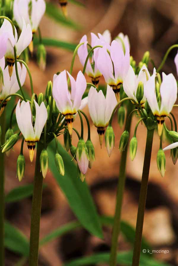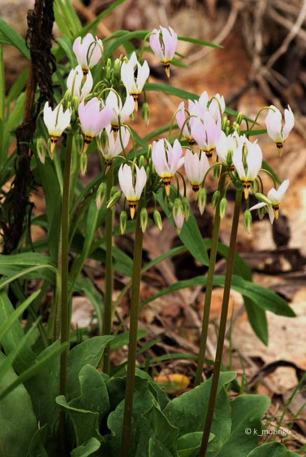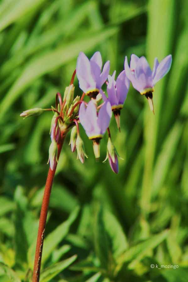 Star The beautiful native Shooting Star is common in our area. It prefers full or partial sun and is only found in high quality habitats including moist to slightly dry black soil prairies, hill prairies and openings in upland forests. This perennial has a basal rosette of leaves (6" long and 2½" across) from which emerges one or more stalks of flowers. The green or red flowering stalk (about 1½' tall) from the rosette produces an umbel of 6-40 white, light pink or lavender or rosy pink flowers dangling downward.