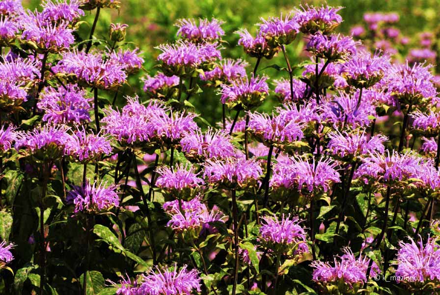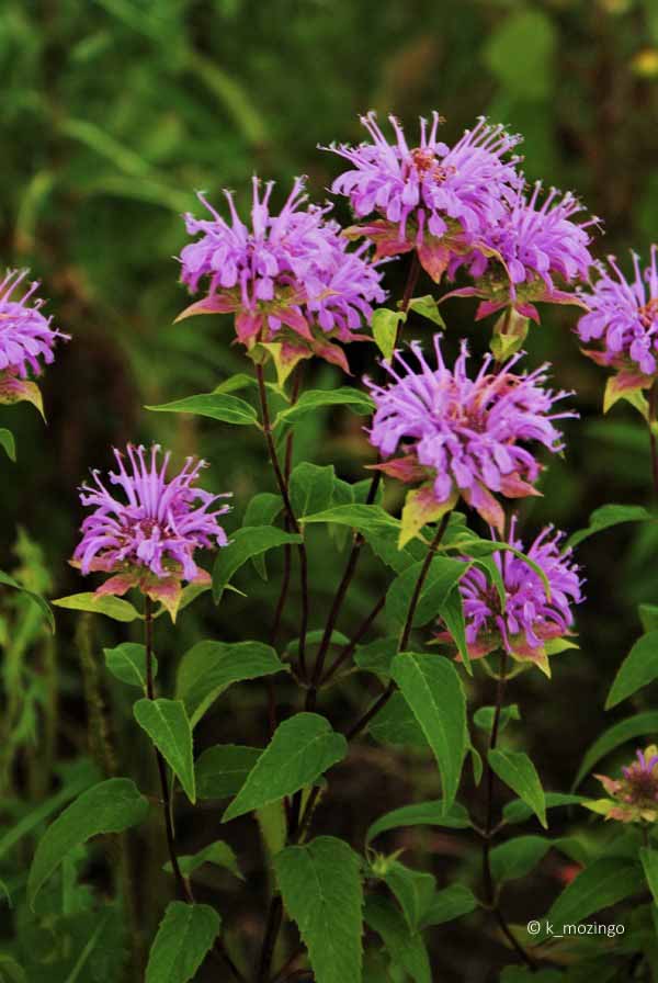 Bergamot The beautiful native Wild Bergamot is common in our area. It prefers full or partial sun and moist to slightly dry conditions. Habitats include black soil prairies, hill prairies, savannas and woodland borders. This perennial is 2˝–4' tall, branching, with toothed, lance-shaped, opposite leaves up to 4" long and 2" across. The stems terminate in rounded (wreath-like) heads (1-3" across) of lavender or pink flowers. Each flower's corolla divides into a tubular upper lip with strongly projecting stamens and three slender lower lips that function as landing pads for visiting insects.