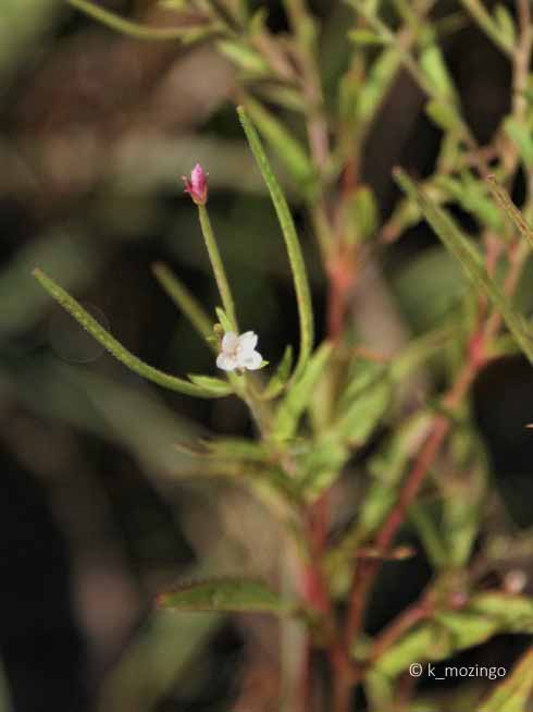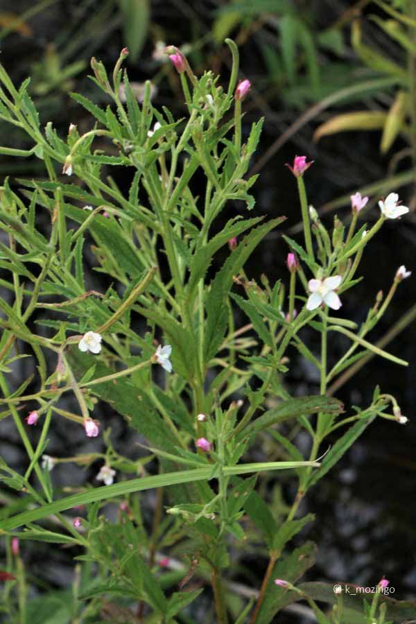 (Purple-leafed Willow-Herb) The native Cinnamon Willow-Herb is common in our area. It prefers full sun to light shade and wet to moist soil. Habitats include poorly drained areas of black soil prairies, marshes, bogs, fens and seeps. This is a fine-hairy branching perennial. 1-4' tall, with numerous purple-tinged veiny lance-shaped toothed leaves up to 4" long and ½" across, sometimes with purple veins or spots. From the upper axils of some of the upper leaves there appears a single 4-petaled light pink or white flower (1/3" across) on a long stick-like stalk.