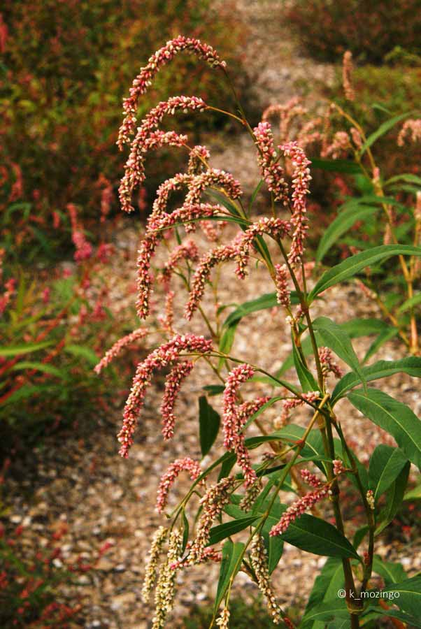 Kendall County (IL) Forest Preserve District Lady's Thumb The non-native (European) Lady's Thumb is common in our area. It prefers full to partial sun and wet to moist fertile soil with organic matter. Habitats include marshy areas, edges of streams, mudflats, moist weedy meadows and waste areas. It is a summer annual, ½–2' tall with branching stems, more or less erect, although individual plants may sprawl. The alternate leaves are up to 6" long and 1" across, lance-shaped and untoothed on short petioles clasping the stem. The leaf's upper surface often has a black smudge that is oval - hence the common name. Upper stems terminate in spike-like racemes of flowers, each about 1/8" across that may be pink, lavender, greenish white, or purple, even on the same raceme.