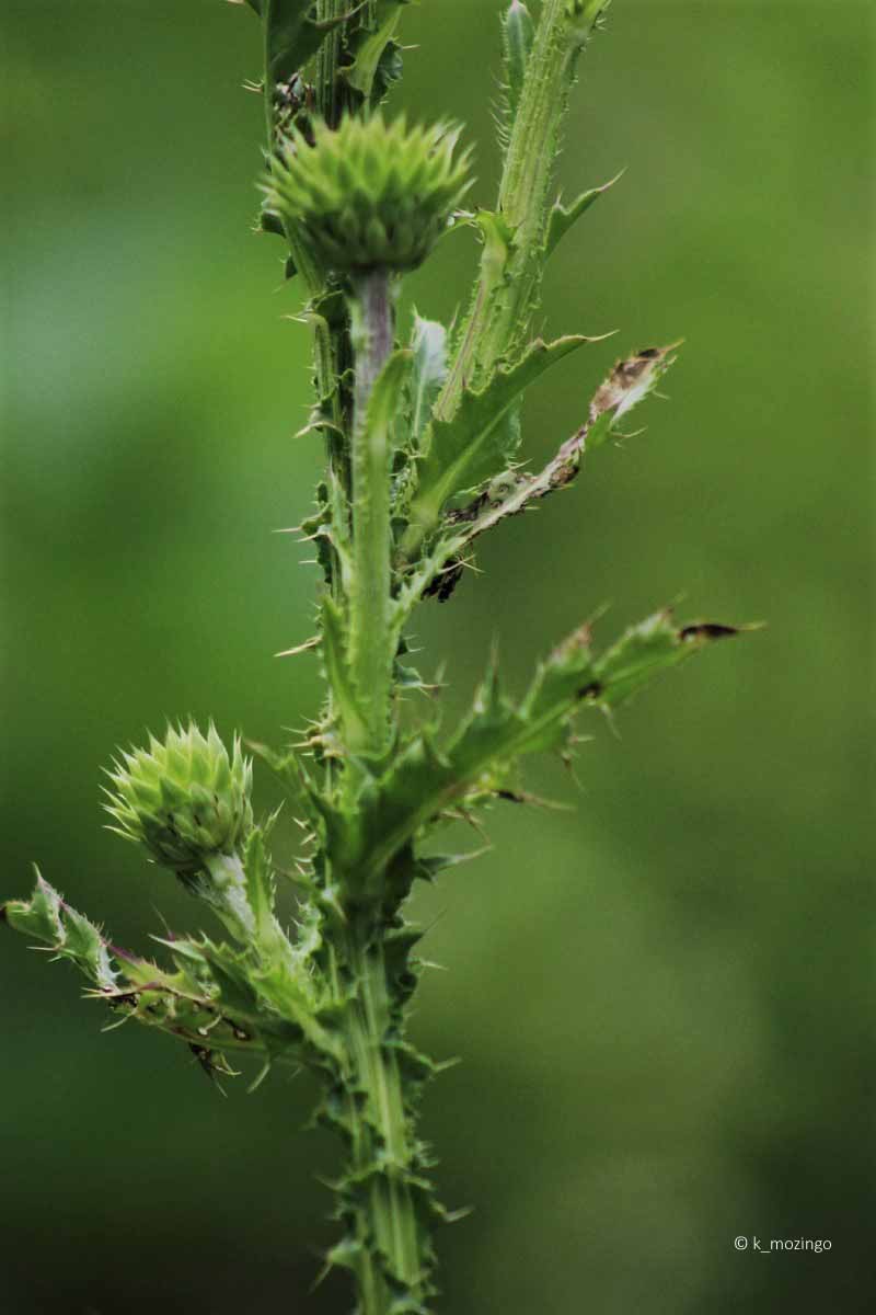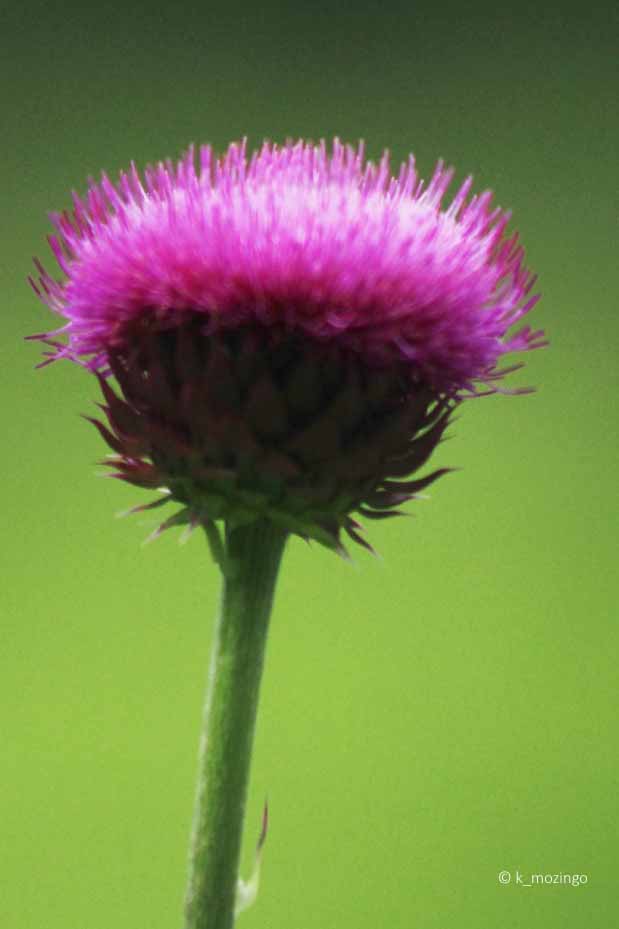 Thistle (Musk Thistle) The non-native (Eurasia and northern Africa) Nodding Thistle is common in our area and is on the Illinois Noxious Weeds List. It prefers full sun and slightly moist limestone soil. Habitats include savannas, pastures, roadsides and waste areas. It is a biennial (or summer annual) that prefers full sun and medium-moist soils. It can grow to 6' tall with alternate leaves, 2-6" long and ½-1½" across and spiny at the lobe tips. The upper stems terminate in individual flowerheads about 1-3" across on long erect peduncles (up to 2'). The flowerheads often nod to one side. Each flowerhead has up to 1000 disk florets that are pink to purplish pink.