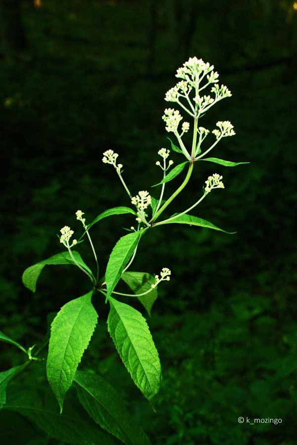 (Joe Pye Weed) The native Purple Joe-Pye Weed is common in our area. This perennial prefers light shade to partial sun and moderately moist rich loamy soil. Habitats include woodland borders and openings, savannas, partially shaded seeps and edges of fens. It is 3-7' tall with whorls of 3-4 leaves, each up to 6" long and 3˝" across, toothed and broadly lance-shaped. The central stem terminates in one or more large dome-shaped panicles of compound flowers. Each compound flower has 5-8 disk florets. The corolla of each disk floret is whitish pink to purplish pink and tubular in shape with 5 tiny teeth along its upper rim. A divided white style is strongly exerted from each disk floret.