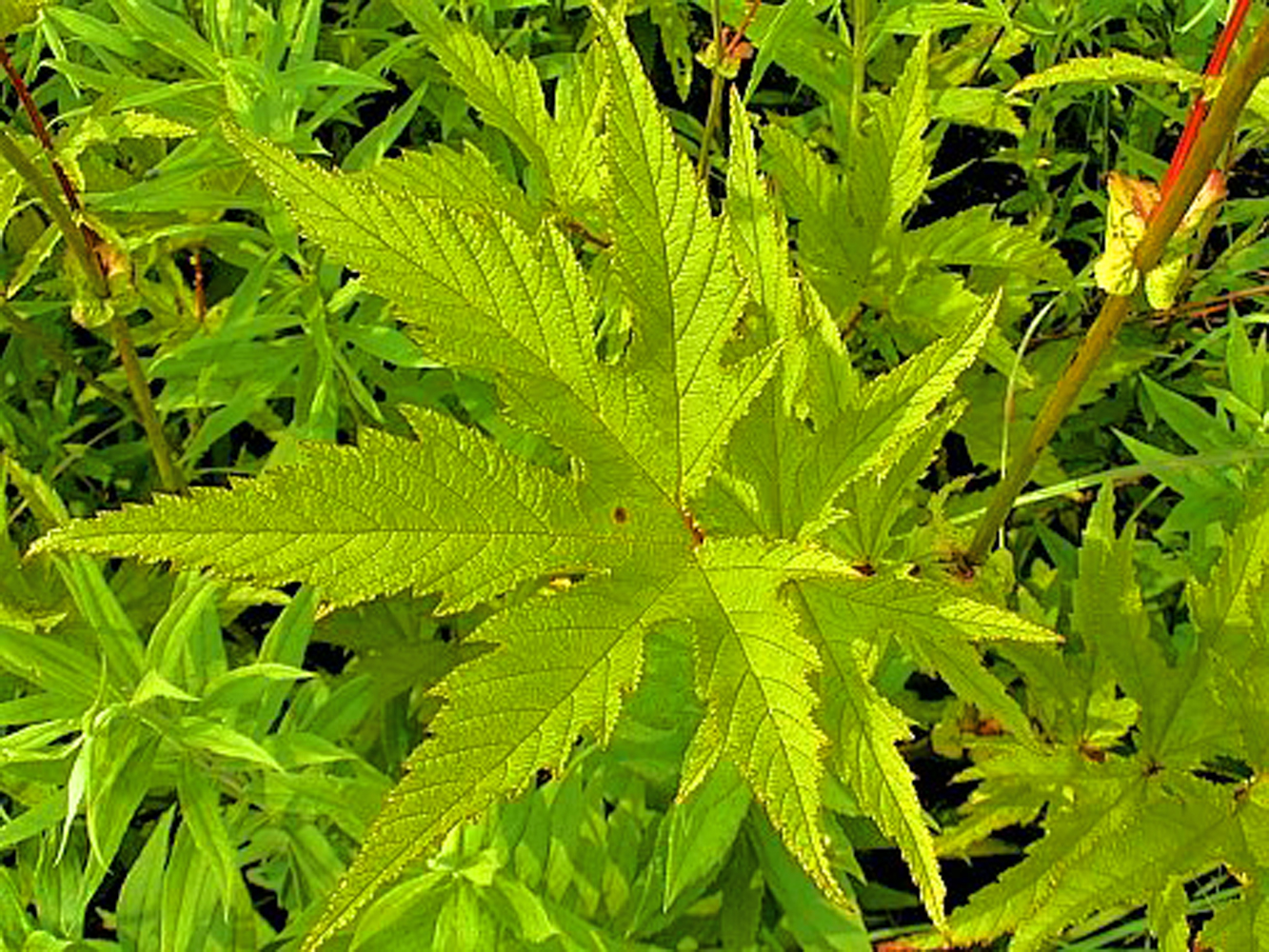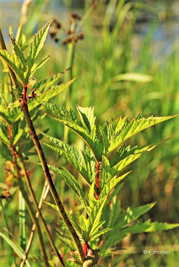 Queen of the Prairie palmate lobed leaves lined up along the stem