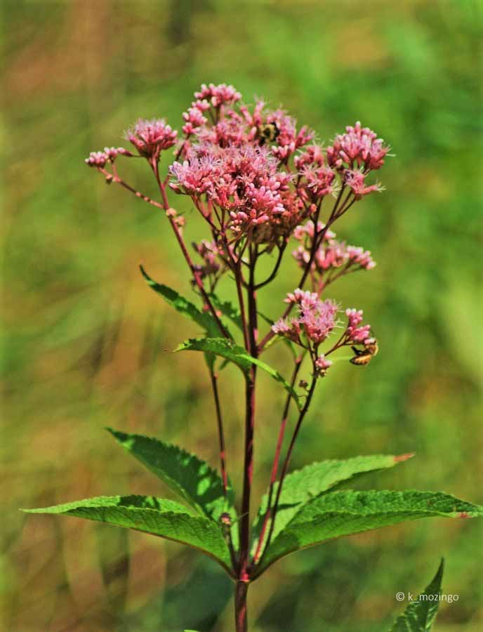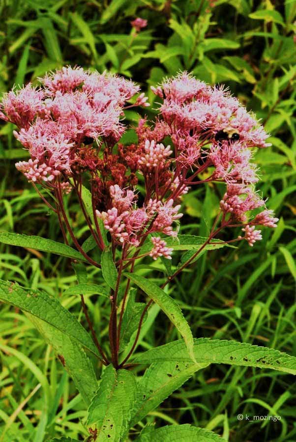 Joe-Pye Weed The beautiful native Spotted Joe-Pye Weed is common in our marshes and fens. It likes full or partial sun, wet to moist mineral-rich soil and is tolerant of water-logged conditions. This perennial is 3-6' tall and unbranched, except for flowerhead-bearing stalks near the apex of the plant. The central stout stem is either purple-spotted or purple. It has whorls of 4-5 leaves, yellowish green, up to 7" long and 2˝" across, broadly elliptic and toothed. The central stem terminates in a panicle of flowerheads spanning 3-6" across. Each narrow flower is about 1/3" long with 8-20 pink to purplish pink disk florets and no ray florets. Each tiny disk floret has a narrow tubular corolla with 5 spreading petals along its upper rim and a strongly exerted style.