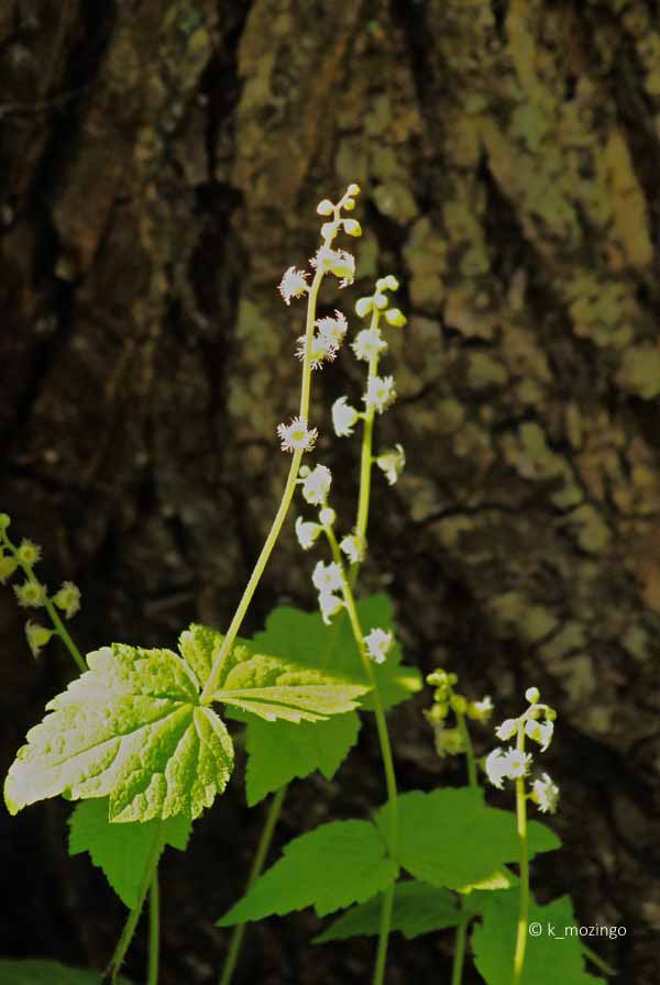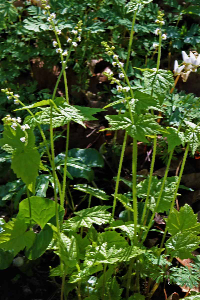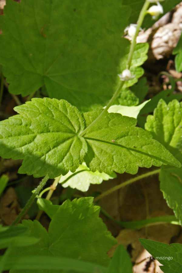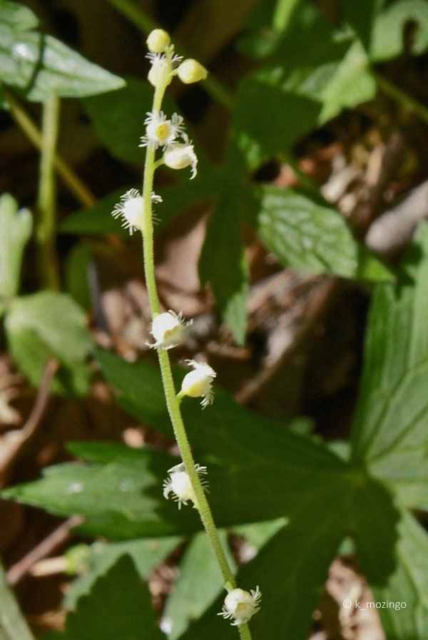 (Twoleaf Miterwort) The native Bishop's Cap is rarely found in our area and is monitored as one of our Plants of Concern. It prefers dappled sunlight during the spring, otherwise shade is tolerated. Habitats include slightly moist areas of woodlands where the soil contains abundant organic matter. This interesting perennial has an erect flowering stalk about 8-16" tall with a single pair of opposite leaves about halfway up the stalk. At the base of the plant, there are basal leaves on long petioles. The flowers are widely spaced along the top of the stalk on very short pedicels. Each white flower is less than ¼" across with 5 white petals, 10 yellow stamens a pair of styles, a greenish white calyx with 5 short petals, and a single-celled ovary. The petals have a fringed appearance.