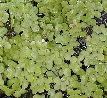 (Small Duckweed) The native Common Duckweed is common in our area. This aquatic requires full or partial sun and fresh water that is stagnant or slow-moving and relatively high in nutrients. Habitats include ponds and lakes, slowing moving creeks and marshes. This floating aquatic presents itself as a colony of tiny (only about 1/8" across) oval thalli. A thallus is a body that combines the functions of leaf and stem. The Duckweed thallus has a slightly succulent texture and is able to float on water because of numerous tiny imbedded air bubbles. Occasionally, a single tiny white flower is produced, about 1/16" across, with a cup-shaped scale, a pistil, and 2 anthers. The tiny floating plants look like algae, but are not. During the summer, Common Duckweed also forms dense colonies of plants from budding. like a carpet on the water's surface.