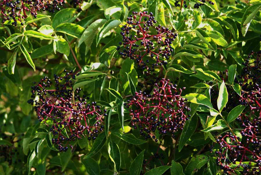 (American Black Elderberry) The native Common Elderberry is quite common in our area. It prefers full to partial sun and moist fertile loamy soil. It is is a deciduous multi-stemmed shrub 4-12' tall. Along its young branches and shoots are pairs of opposite compound leaves 6-12" long, mostly simple-pinnate with 5-9 leaflets (2-4 pairs of opposite leaflets and one terminal leaflet). The leaflets are 2½–5" long and ¾–2" across, lance-shaped and toothed. The upper stems terminate in umbel-like panicles (3-10" across) of white flowers (about ¼" across) which are replaced later by drupe-like juicy fruits about 3/16" across that become dark purple to black as they mature. The fruits are very attractive to birds and squirrels.