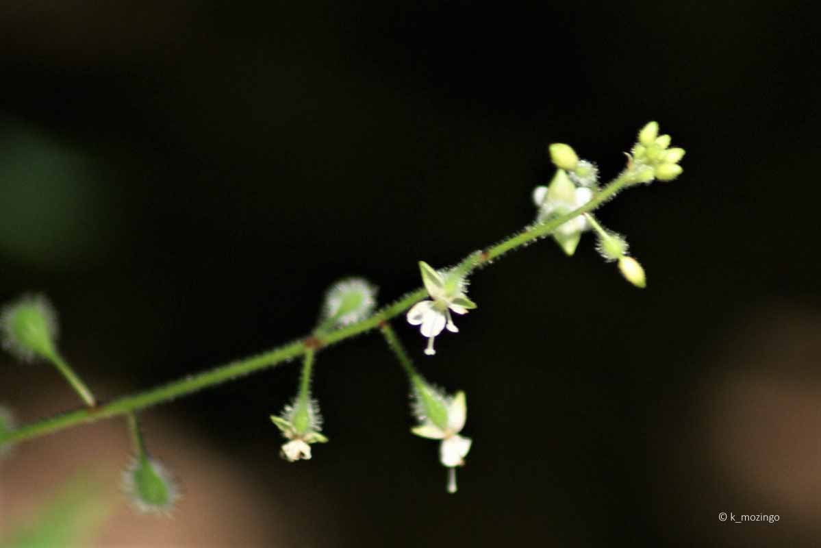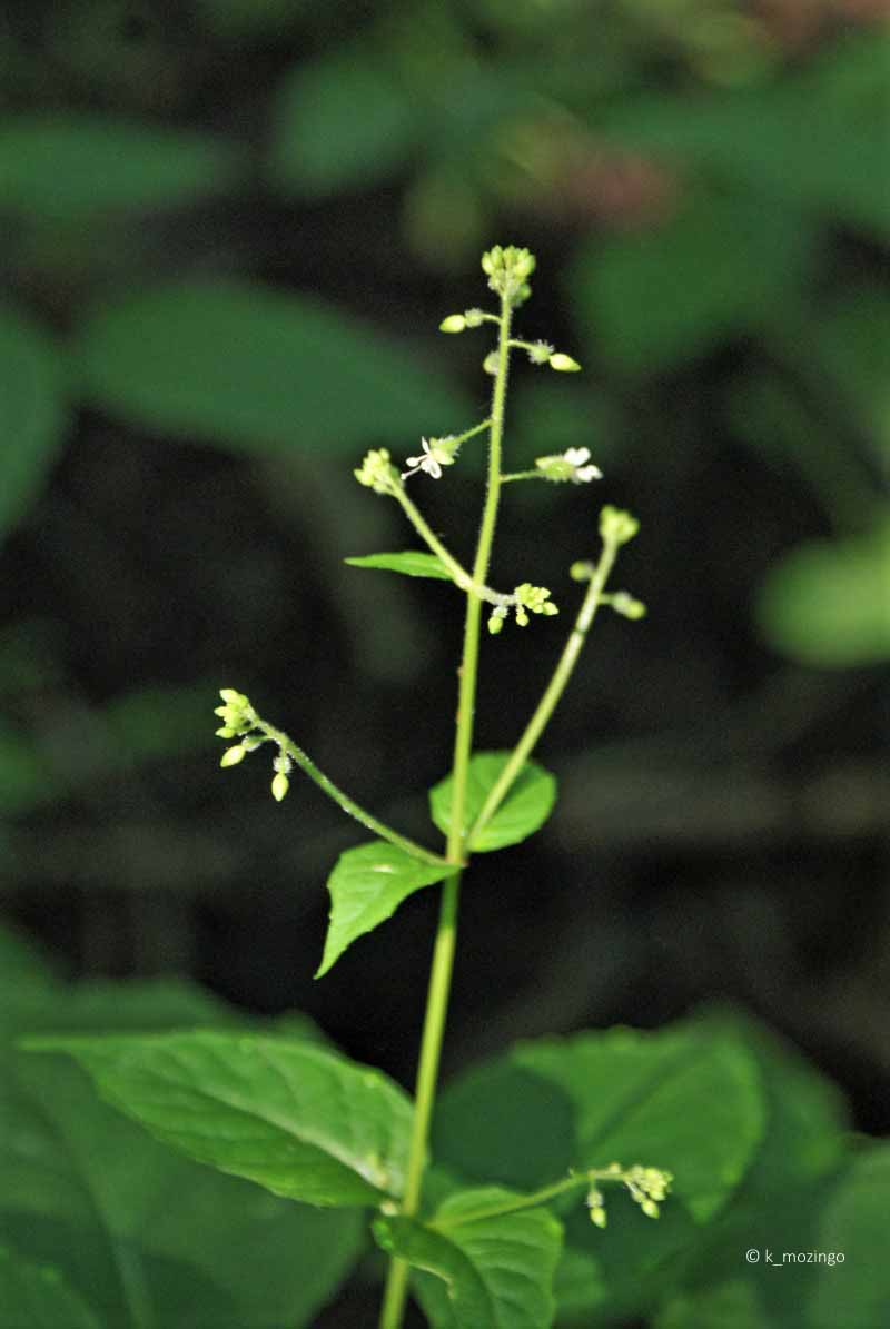 (Broadleaf Enchanter's Nightshade) The native Enchanter's Nightshade is common in our area. It prefers dappled sunlight to medium shade and a slightly moist rich loamy soil. This perennial is ¾-2' tall and unbranched or little branched. The opposite leaves are up to 5" long and 3" across. The central stem terminates in a raceme of flowers up to 6" long. Each flower has 2 white petals, 2 green sepals, 2 stamens, and a slender style. The flowers later develop small burs.