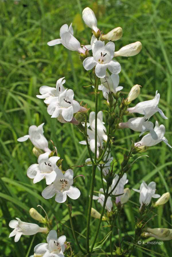 (Foxglove Penstemon) The native Foxglove Beard Tongue is uncommon in our area. It prefers full or partial sun, average levels of moisture, and loamy soil. In the spring, one or more flowering stems emerge from the clustered purplish rosettes and grow to about 3' tall. The opposite leaves are hairless and lance-shaped. The white flowers occur in a panicle at the top of each flowering stem. They are tubular in shape and about 1" long, with the corolla divided into a lower lip with 3 lobes, and and an upper lip with 2 lobes. Fine lines of violet within the corolla serve as nectar guides to visiting insects. Foxglove Beard Tongue is very much like Smooth Beard Tongue but blooms much earlier.