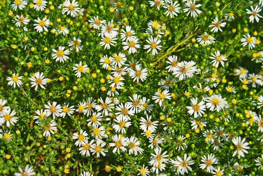 (Frost Aster) The native Hairy Aster is common in our area. It prefers full sun and slightly moist to dry conditions. This perennial grows to 3½' tall and similarly across, sending up one or more leafy stems that branch occasionally. The stems are light green and hairy. The alternate leaves are up to 4½" long and ¾" across toward the base of the plant, becoming gradually smaller up the stems. The upper stems terminate in panicles of flowers up to 2' long and 1¼' across. Individual flowers are about ½–¾" across, consisting of 15-35 ray florets that surround a flattened head of disk florets. The petaloid rays of these flowers are white (or light pink or light blue-violet) and widely spreading when fully open.