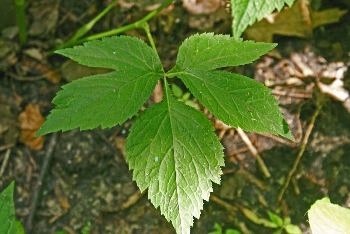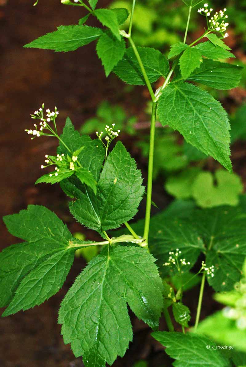 (Canadian Honewort) The native Honewort is common in disturbed woodlands in our area. It prefers medium to light shade and moist to slightly moist loamy soil with decaying organic material. This perennial is 1-3' tall, unbranched toward the base, but branches occasionally in the upper half. The compound leaves are trifoliate with leaflets up to 4" long and 2" across, becoming smaller as they ascend the stems. The upper stems terminate in compound umbels of tiny white flowers. Each umbel divides into about 3-10 umbellets consisting of 3-10 tiny 5-petaled white flowers less than 1/8" across.