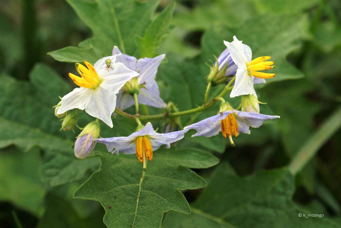 (Carolina Nightshade) Horse Nettle is native to the southern U.S. and is now very common in our area. It prefers full sun and moist to dry conditions. Habitats include prairies, openings and edges of woodlands, areas along roads, vacant lots and other waste areas. This perennial is up to 3' tall, branching occasionally. The stems have scattered white or yellow spines. The alternate leaves are up to 6" long and 3" across and rather angular along the margins with white hairs and scattered spines along the central vein on the underside of each leaf. The upper stems terminate in small clusters of star-shaped flowers, white or light violet, about ¾" across, and having 5 petals united at the base and 5 elongated yellow anthers in the center. Afterwards, green fruits develop that are about ½" across, later turning blue-black and then yellow, but are not edible to humans.