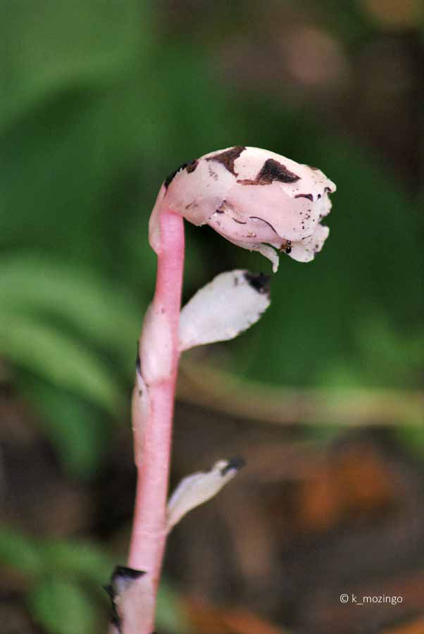 (Ghost Plant) The native Indian Pipe is rarely found in our area and is one of our Plants of Concern. This unusual perennial may be found in rich high quality woodlands in shady areas with abundant humus. It typically consists of a cluster of unbranched erect white stems about 3-7" tall. The alternate leaves are scale-like and small. Like the stems, they are white, translucent, and hairless. Each stem terminates in a single white flower about ½–¾" long that is nodding and narrowly bell-shaped. After the blooming period, the entire organism becomes dark brown or black, and each flower is replaced by an erect ovoid seed capsule about ½" long. It is a saprophyte without chlorophyll in its tissues and forms either a symbiotic or parasitic association with mycorrhizal fungi through its roots. Since Indian Pipe does not rely on photosynthesis, it can adapt to deep shade.