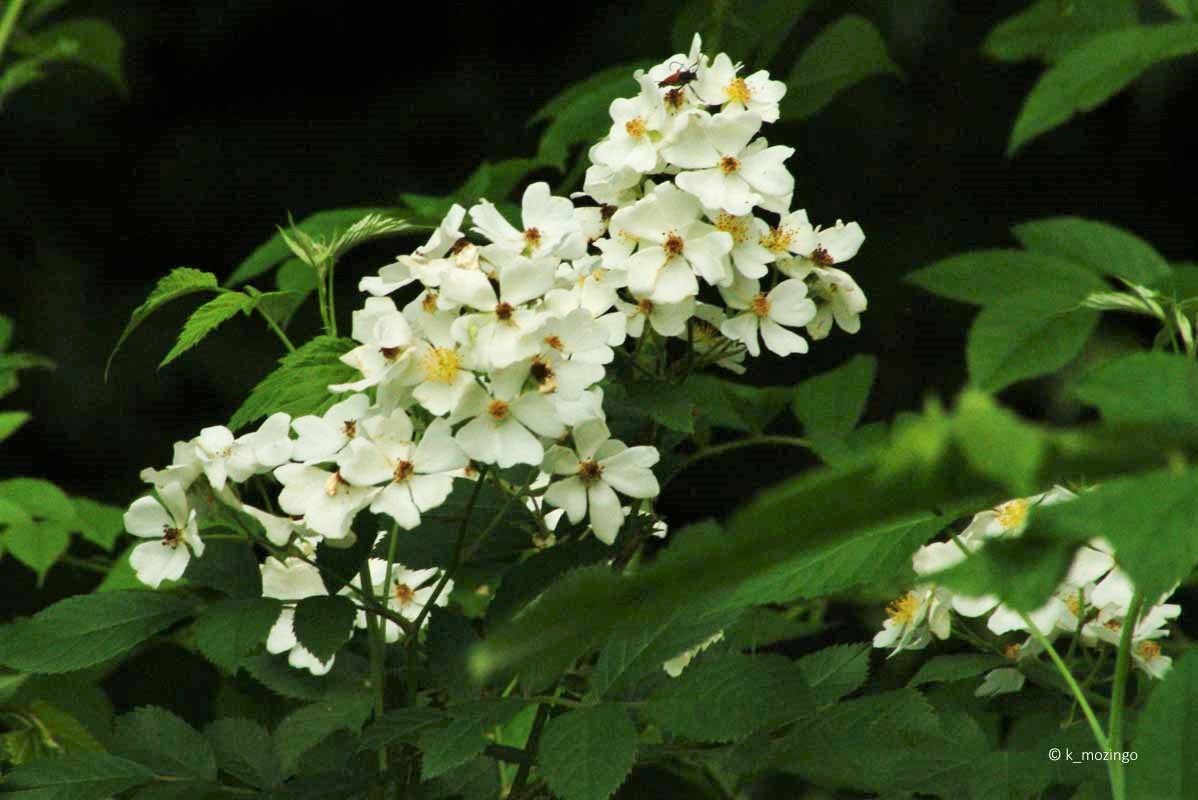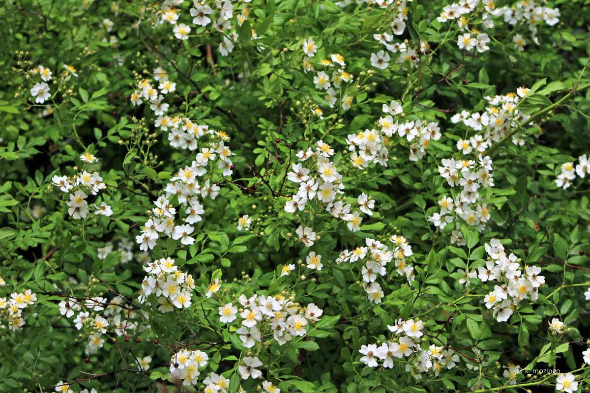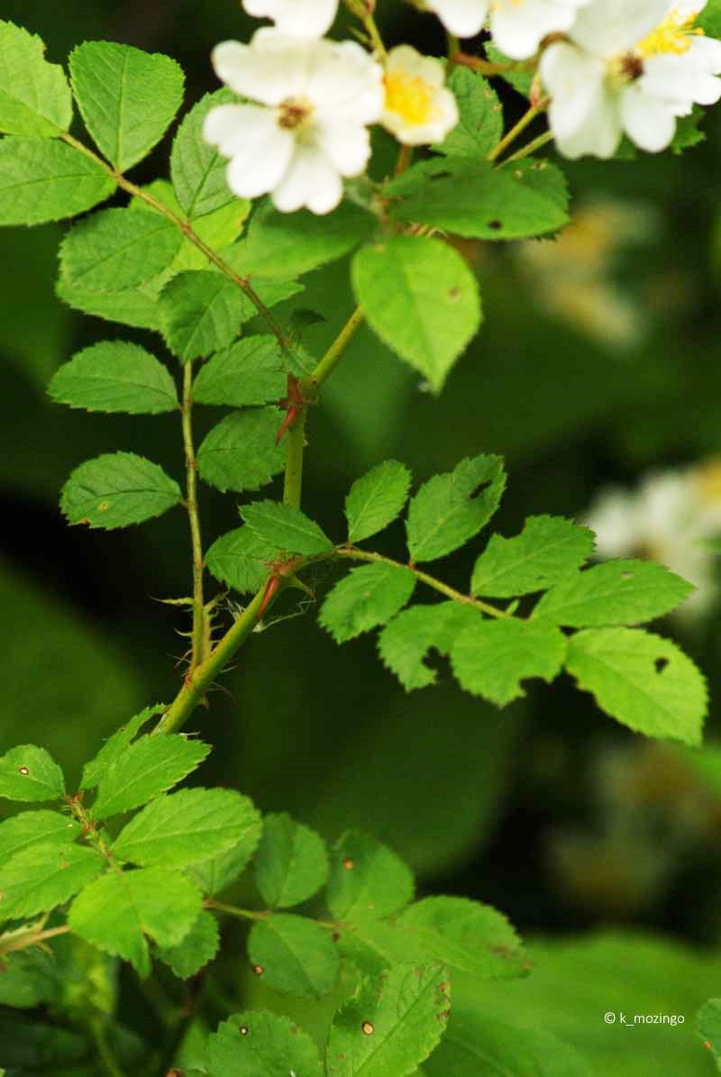 Kendall County (IL) Forest Preserve District Multiflora Rose (Japanese Rose) The non-native (Asian) Multiflora Rose is very common (unfortunately) in our area. It is a very aggressive invasive that keeps moving into our natural areas and is difficult to get rid of once it becomes established. It prefers partial sun and slightly moist fertile loamy soil. Habitats include open deciduous woodlands, woodland borders, thickets, weedy meadows along rivers and semi-shaded areas along roadsides. This perennial has woody stems and can assume the form of a 3-6' tall shrub or a climbing vine up to 10' tall on other vegetation. The stems are heavily armed with stout curved thorns. The alternate compound leaves are odd pinnate with 5-9 leaflets up to 2½" long and ¾" across. The flowering stalks produce an abundance of white flowers on spreading racemes. Each flower is about 1½" across with 5 white petals. Fertile flowers are replaced by rose hips (about ¼" across) that turn orange-red to red with maturity. Multiflora Rose at Pickerill/Pigott Forest Preserve May 31, 2015 Multiflora Rose at Jay Woods Forest Preserve June 9, 2015