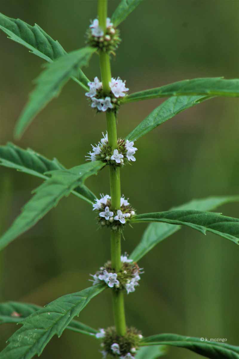 Northern Bugleweed The native Northern Bugleweed of the mint family is uncommon in our area. It prefers partial sun, wet to moist conditions, and soil containing some sand and organic material. Habitats include openings in floodplain woodlands, swamps, soggy thickets and meadows, and low areas along pools of water. This perennial is 1-2½' tall and unbranched with an erect 4-angled central stem. Pairs of opposite leaves 1½-4" long and ½-1½" across occur along the stem. They are lance-shaped with 5-7 teeth on each side. Dense clusters of flowers occur at the middle to upper leaf axils, whorled around the central stem. Each tiny flower has a light green calyx with 4-5 teeth and a white (slightly blueish) short-tubular corolla, about 3/16" across, with 4-5 lobes.