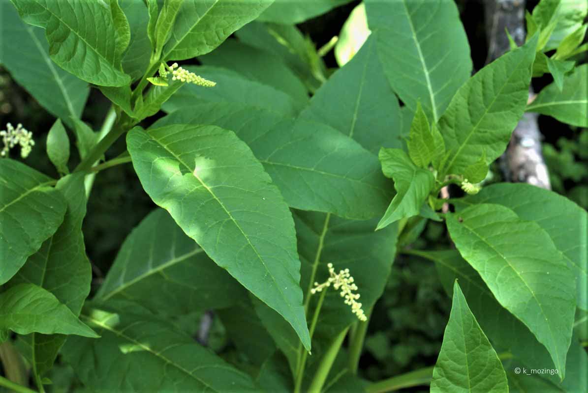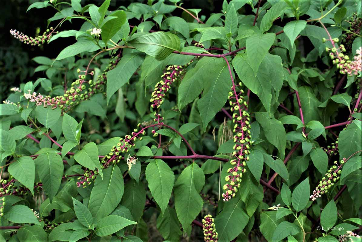 Pokeweed The native Pokeweed is common in our area. It prefers partial sun, moist conditions, and rich loamy soil. Habitats include moist meadows in woodland openings, woodland borders, abandoned fields, vacant lots and disturbed areas. This perennial is up to 8' tall, branching regularly with stems that are smooth, round and hairless. The alternate leaves can be large, up to 10" long and 4" across. Many of the stems terminate in narrow flower racemes, about 3-6" long and 1" across, cylindrical in shape, and often drooping, with numerous small flowers all around the flowering stalk on short pedicels. The flowers are about ¼" across, with 5 lobed white or pink sepals that flare outward. After the flowers fade away, fruits develop, about ¼" across, later becoming dark purple.