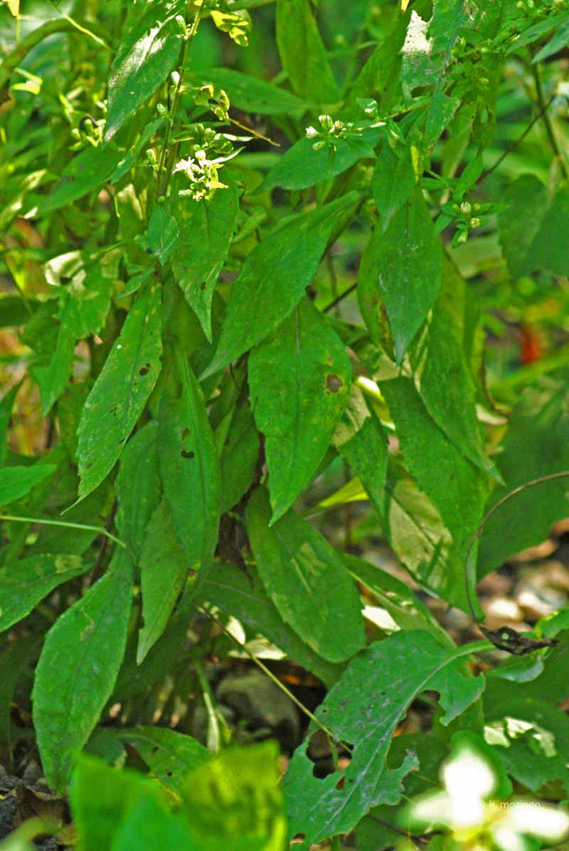 (Calico Aster) The native Side-Flowering Aster is common in our area. It prefers light shade to partial sun and moist conditions. Habitats include moist meadows near woodlands and rivers, floodplain forests and flatwoods, woodland borders, seeps and swamps. This perennial is about 2-4' tall, branching occasionally and often leaning toward one side. The alternate narrowly lance-shaped leaves are up to 4½" long and ½" across, becoming much smaller as they ascend the stems. The upper stems and some of the side stems produce panicles, up to 10" long and 5" across, of flowers scattered along one side of the stem. Each flower is about 1/2" across with white rays.