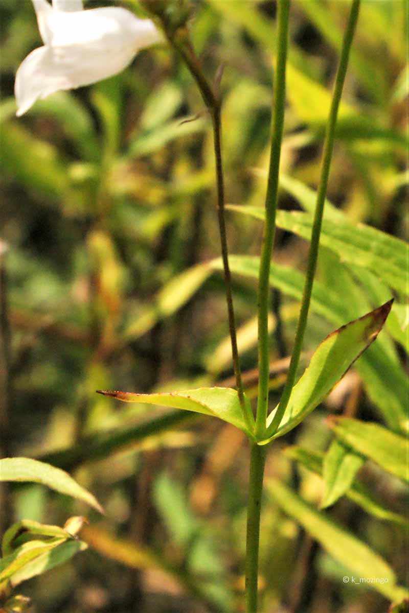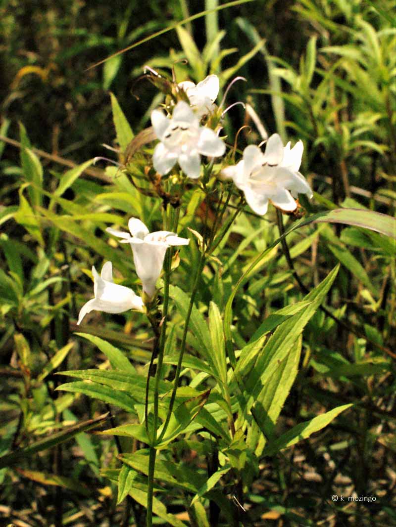 (Long-sepaled Beardtongue) The native Smooth Beard Tongue is rare in our area. It prefers full or partial sun, average levels of moisture, and loamy soil. In the spring, one or more flowering stems emerge from the clustered purple rosettes and grow to about 3' tall. The opposite leaves on the flowering stems are hairless and lance-shaped. The white flowers occur in a panicle at the top of each flowering stem. They are tubular in shape and about 1" long, with the corolla divided into a lower lip with 3 lobes and and an upper lip with 2 lobes. Smooth Beard Tongue is very much like Foxglove Beard Tongue but blooms later.