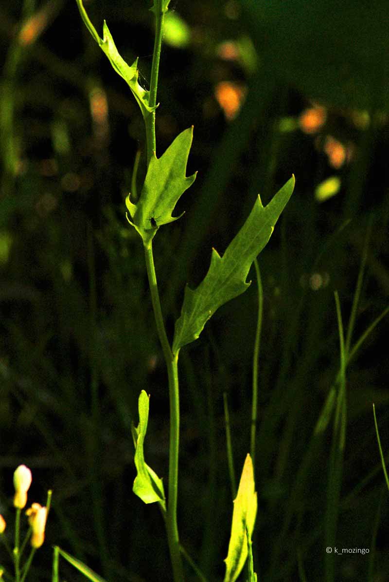 (Bulbous Cress) The native Spring Cress is common in our area. It prefers partial sun or dappled sunlight and wet to moist conditions. Habitats include low woodlands along rivers, damp depressions in rocky bluffs, woodland seeps, springs and damp meadows. This perennial is ½–1½' tall with an erect stem that is unbranched or sparingly branched toward the apex where the inflorescence occurs. There are both basal leaves (up to 1¼" long and 1" across) and alternate leaves up to 2" long and 1" across. The central stem terminates in a raceme of flowers with 4 white petals with rounded tips.