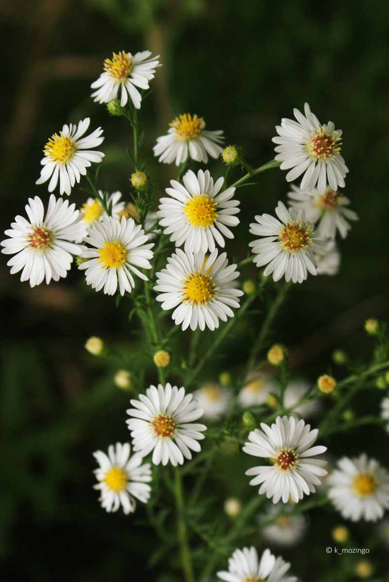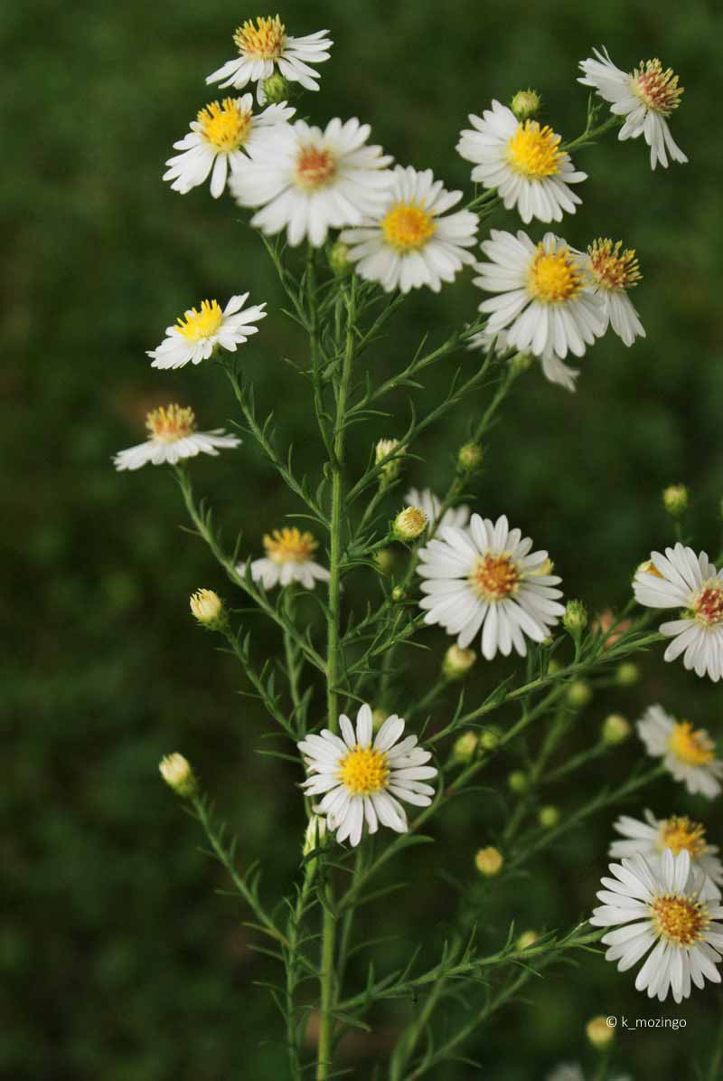 (White Aster) The native Stiff Aster is rare in our area. It prefers full sun and dry sandy or gravely soil. It is an upright, low-growing, open, bristly perennial up to 2' tall with rough, rigid, narrow leaves and open showy clusters of stringy, dime-sized white blooms.