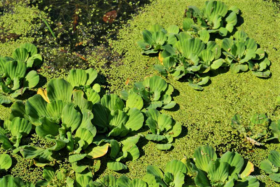 Water Lettuce (Water Cabbage) The non-native (African) Water Lettuce is uncommon in our area. It is very aggressive invasive aquatic that is illegal in some states. It can form thick floating mats clogging a waterway or covering the entire surface of a pond causing oxygen depletion and fish kills. It is free-floating with roots hanging submersed beneath the floating leaves, except when stranded in the mud. It has many spongy, dusty green simple leaves arranged in a spiral pattern from the center of the plant overlapping each other, like a lettuce, without petioles. The 1 - 6" wide leaves are covered with very fine hairs and have large veins running their length. The small white to greenish-white flowers are usually hidden down between the leaves and are seldom seen.