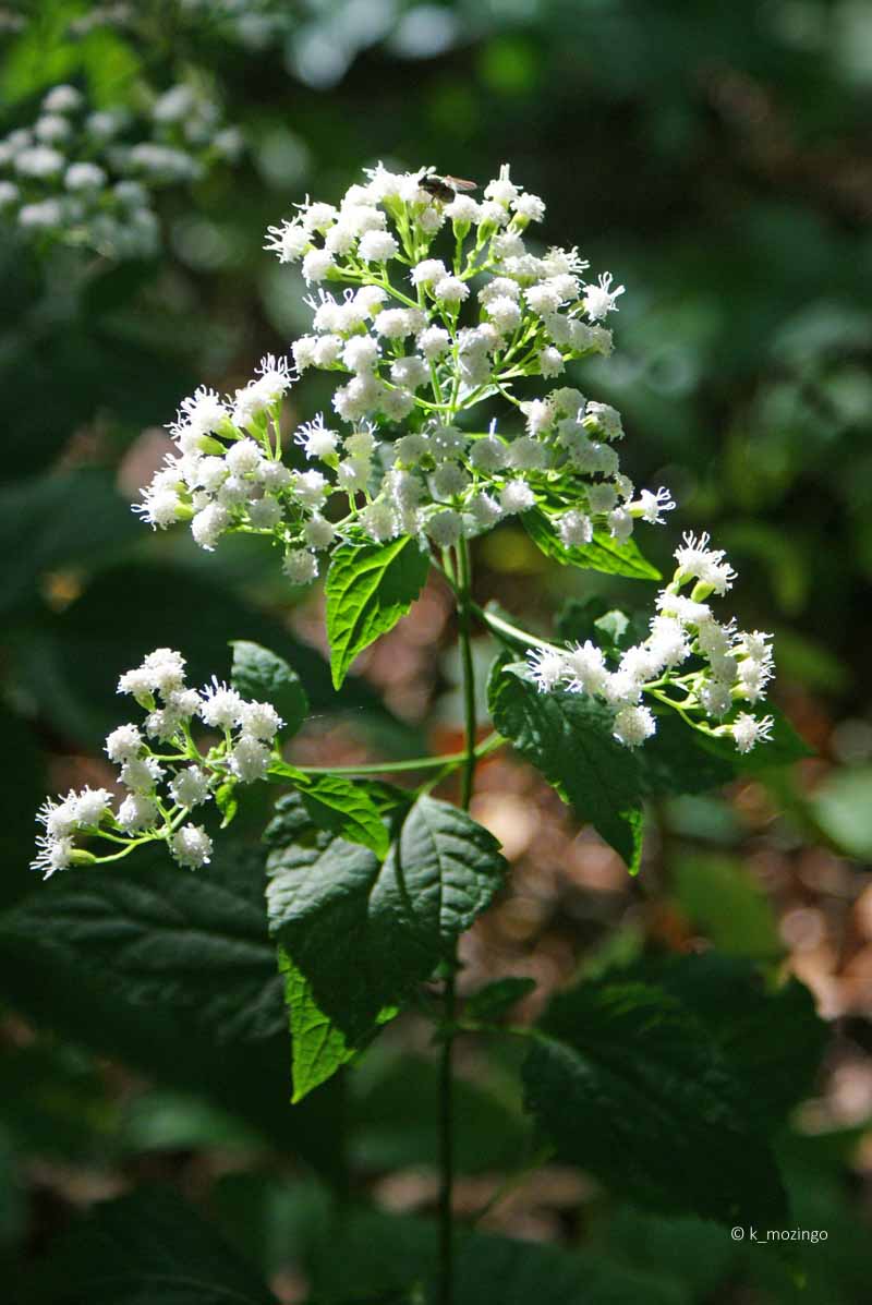 White Snakeroot The native White Snakeroot is common in our area. It prefers partial sun to light shade and moist to slightly dry loamy soil. Habitats include deciduous woodlands, woodland borders, thickets and partially shaded seeps. This perennial is 1½–4' tall, branching occasionally, with opposite leaves up to 5" long and 3½" across, becoming smaller as they ascend the stems. The leaves are hairless and strongly toothed with 3 prominent veins on the upper surface. The upper stems terminate in compound flat-headed panicles of flowers spanning 2-6" across. Each flower is about ½" across and contains 10-30 disk florets. Each disk floret is about 1/8" across with a small tubular brilliant white corolla with 5 lobes.