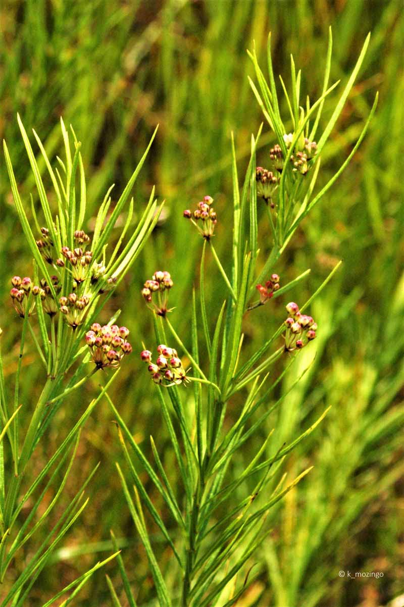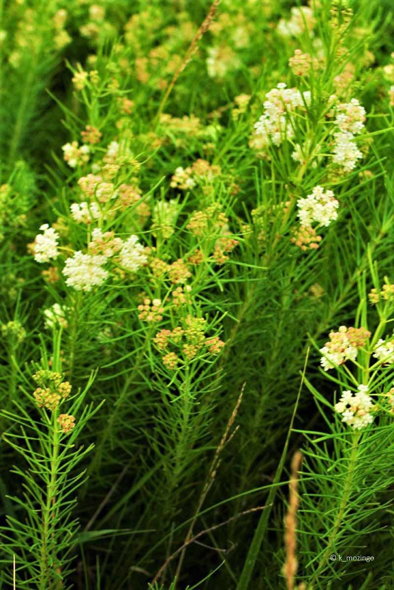 Whorled Milkweed The native Whorled Milkweed is common in our area. It prefers full sun and slightly dry infertile soil. Habitats include prairies, openings in rocky upland forests and grassy slopes along highways. This perennial is 1–2' tall, erect and sometimes branched in the upper half. Whorls of 4-6 very thin leaves (about 2-3" long) occur along the nodes of the central stem. From the axils of middle to upper leaves, 1-4 umbels (¾–1½" across) of white or greenish white flowers are produced on short stalks. Each umbel has 7-20 flowers, each about 3/8" long and 3/16" across with 5 petals. Afterwards, cross-pollinated flowers are replaced by erect seedpods that later open to release their seeds to the wind.