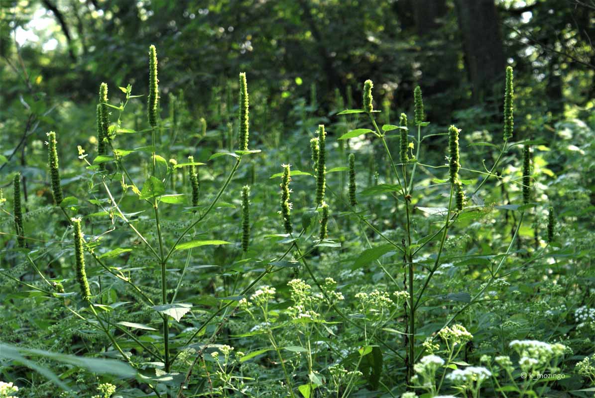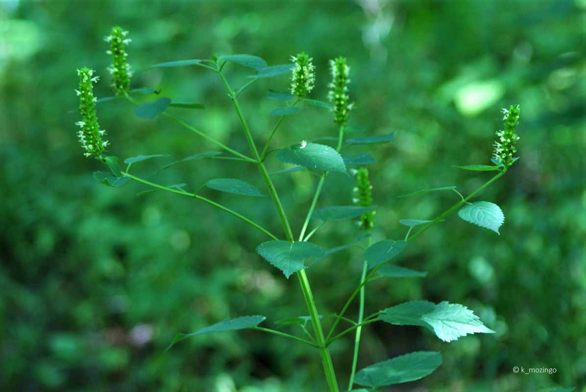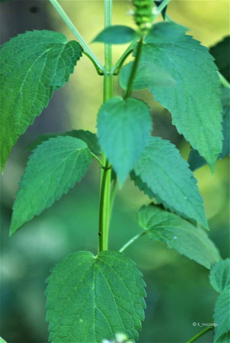 Yellow Giant Hyssop The native Yellow Giant Hyssop is uncommon in our area. It prefers light shade to partial sun and slightly moist fertile loamy soil. Habitats include deciduous woodlands, woodland borders, thickets and meadows in wooded areas. This perennial is 4-7' tall and little branched, except for a few stems from the mid to upper leaf axils. The central stem is 4-angled (square) and strongly winged. The toothed opposite leaves are up to 6" long and 3" across on petioles up to 2" long. The stems terminate in erect flower spikes 4-16" long and ¾–1" across with flowers densely crowded around the spike. Only a few flowers bloom at the same time. Each flower is about 1/3" long with a white (or pale greenish yellow) tubular corolla with 2 upper petals, 2 lateral petals, and a lower petal, and 4 strongly exerted stamens. This plant's stem branching and upright flower spikes give it an upside-down candelabra appearance.