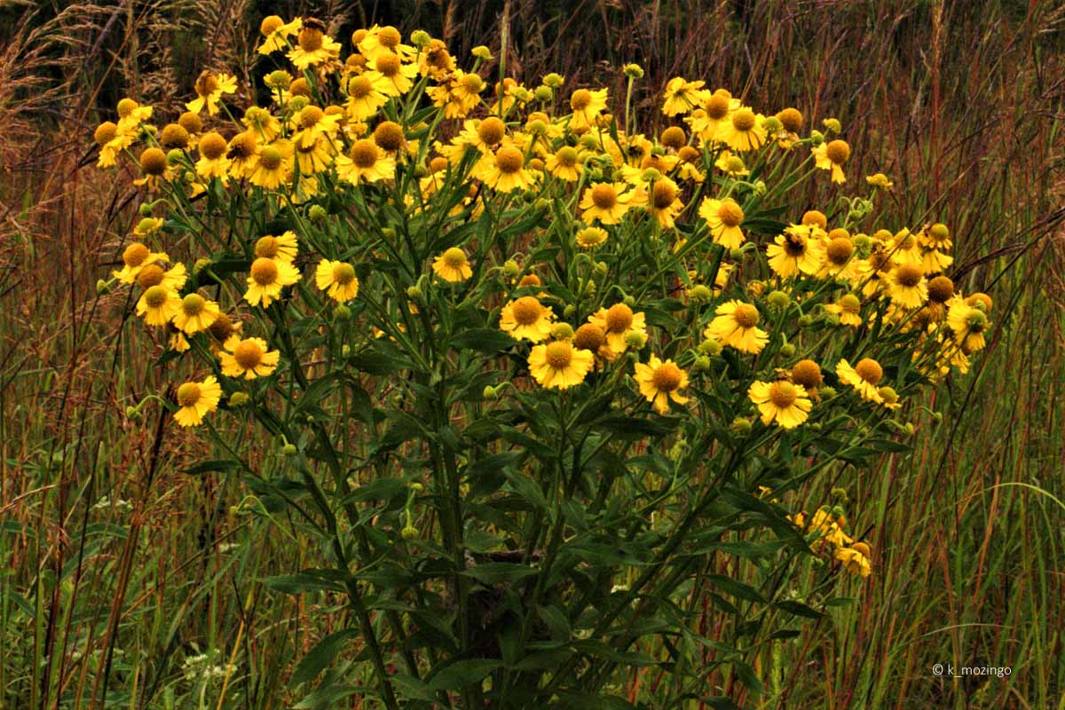 Common Sneezeweed The native Common Sneezeweed is common in our area. Despite its name, it does not cause sneezing. It prefers full to partial sun, wet to moist conditions and soil containing loam or silt high in organic material. Habitats include moist meadows in wooded areas, moist open woodlands, fens, marshes and low areas along streams and ponds. This perennial is 3-5' tall, branching sparingly with angular, winged stems and alternate lance-shaped leaves up to 5" long and 1½" across. Upper stems terminate in flowers spanning about 1½-2" across with bright yellow ray florets (slightly triangular with doubly notched tips) surrounding numerous yellow disk florets.