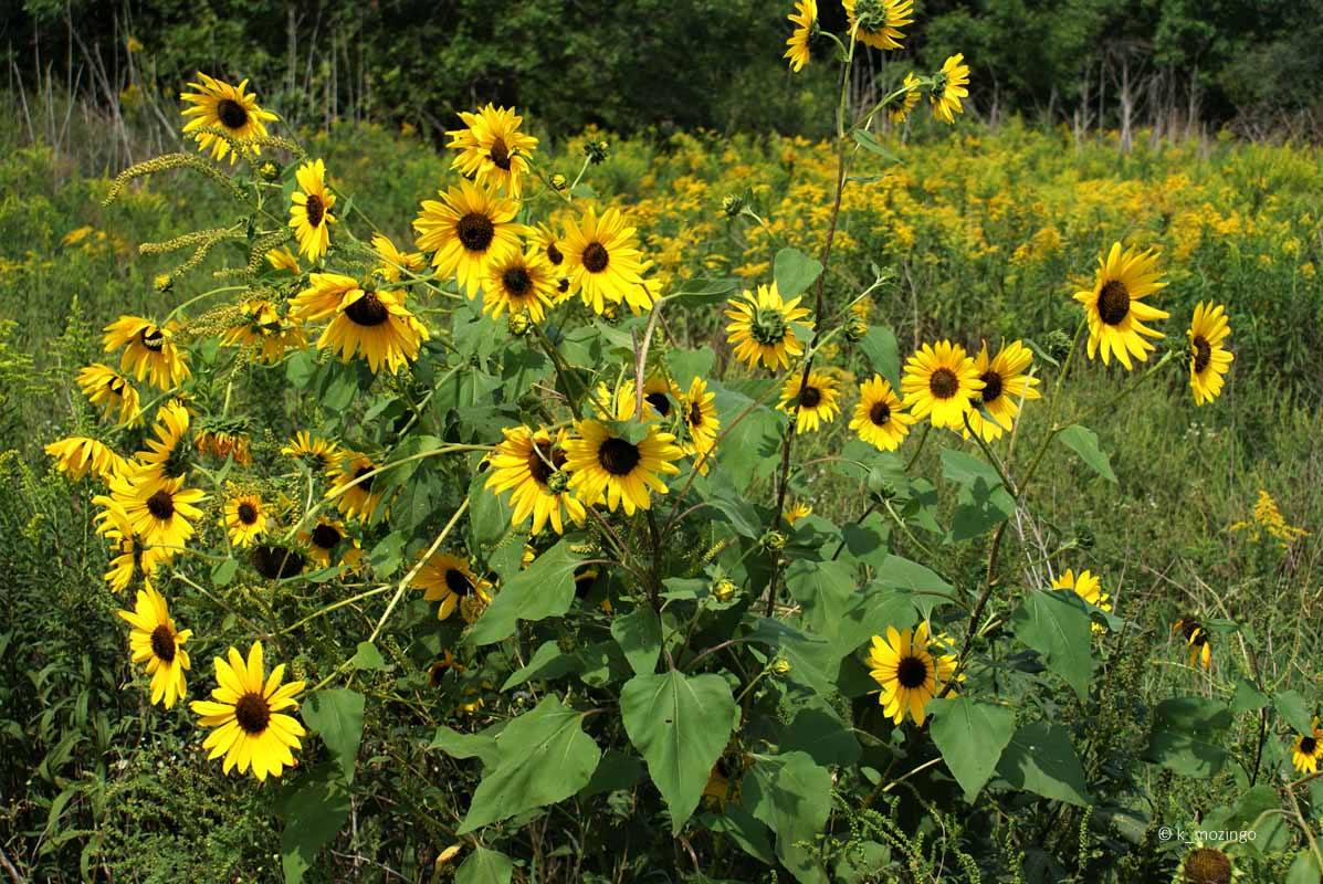 Kendall County (IL) Forest Preserve District Garden Sunflower (Common Sunflower) The non-native (from western U.S.) Garden Sunflower is common in our area. It prefers full sun, moist to slightly dry conditions, and a fertile loamy soil. Habitats include disturbed areas of prairies and meadows in wooded areas. This robust annual has a stout central stem 3-9' tall. The large alternate leaves are up to 8" long and 6" across, finely toothed and have a tendency to droop downward from the long petioles. The daisy-like flowers (3-5" across) have numerous central yellow to brown disk florets (each about 1/8" across) surrounded by 20-40 bright yellow ray florets. Garden Sunflower at Rose Hill Subdivision September 5, 2012 Garden Sunflower at Rose Hill Subdivision September 5, 2012 Garden Sunflower at Rose Hill Subdivision September 5, 2012 Native Americans used the seeds of several Sunflower species for food and ground them up to use as a thickener in soups and stews. Reminder: see our Do Not Disturb Notice. Click here for more information. Copyright © 2011-2017 by Kendall County Forest Preserve District. All Rights Reserved. |