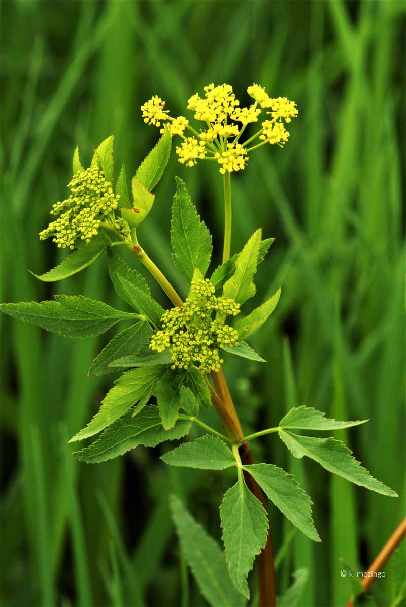 (Golden Zizia) The native Golden Alexanders is common in our area. It prefers full to partial sun and moist, loamy soil. Habitats include openings in moist woodlands, woodland paths, savannas and thickets. This perennial is up to 2½' tall with light green hairless stems. The shiny compound leaves on long petioles are odd-pinnate with 3 or 5 leaflets up to 3" long and 2" across, toothed, with some larger leaflets having 1-2 cleft lobes. At the stem ends, rounded compound umbel (2-3" across) of yellow flowers occur. Each compound umbel has about 12 umbellets with about 21 flowers each. Each flower is about 1/8" with 5 incurved yellow petals.
