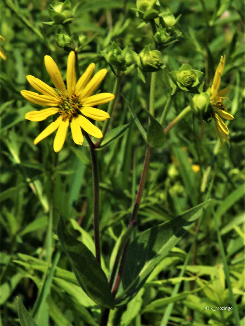 Hairy Sunflower (Stiff-Hair Sunflower) The native Hairy Sunflower is uncommon in our area. It prefers full or partial sun, medium to dry soil. Habitats include thinly wooded bluffs, upland savannas, borders of upland woodlands, black soil prairies and roadsides. This perennial is 2½-5' tall and usually unbranched with a central stem that is often reddish purple and covered with stiff hairs. Pairs of opposite leaves occur along the central stem that are 2½-6" long and ½-2½" across, narrowly lance-shaped on short petioles and rough with minute stiff hairs. The central stem terminates in flowers on erect stalks 1-4" long. The widely-spreading flowers are 2-3" across with 10-15 bright yellow ray florets surrounding numerous yellow disk florets.