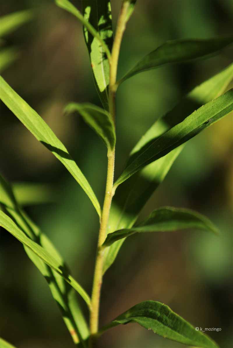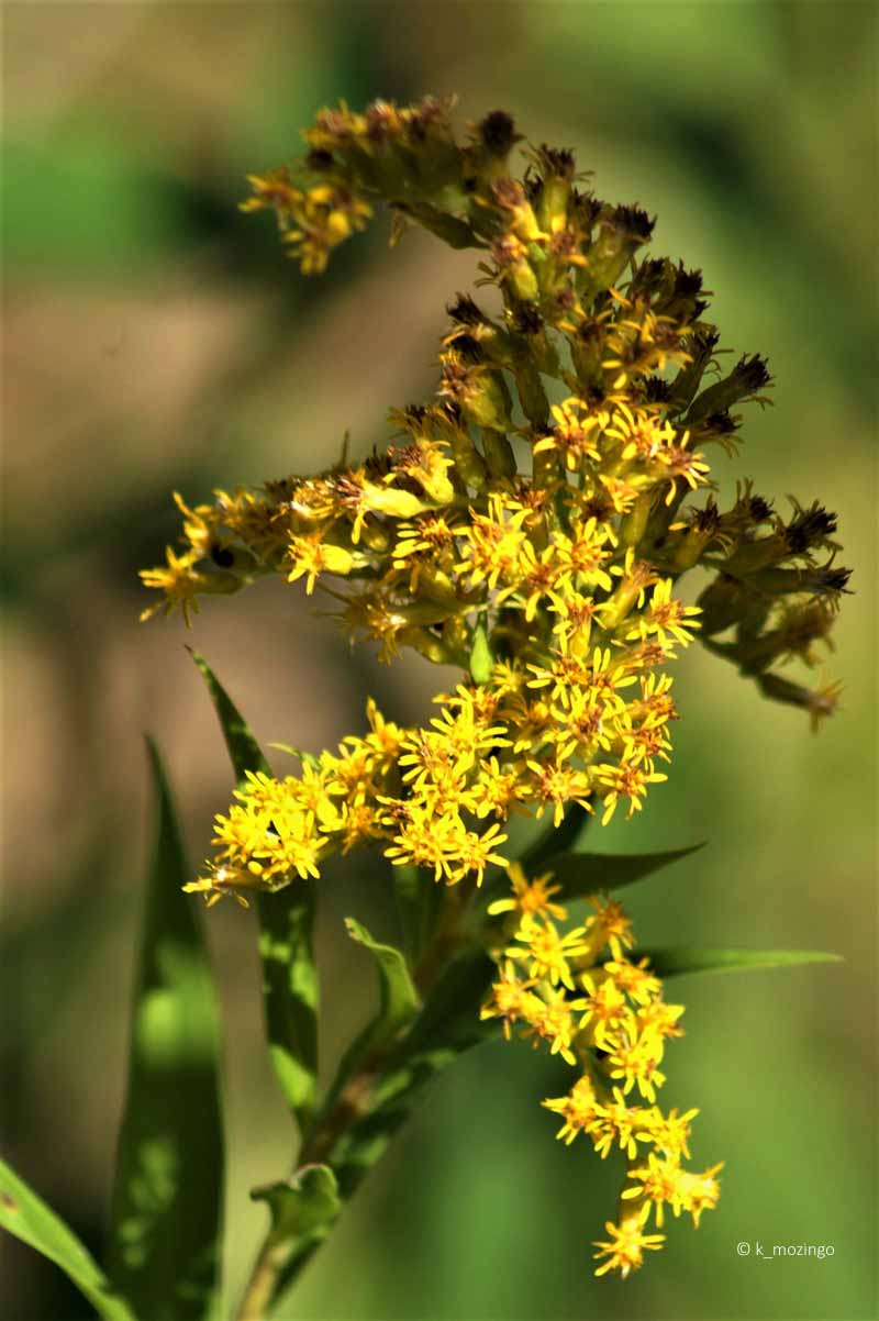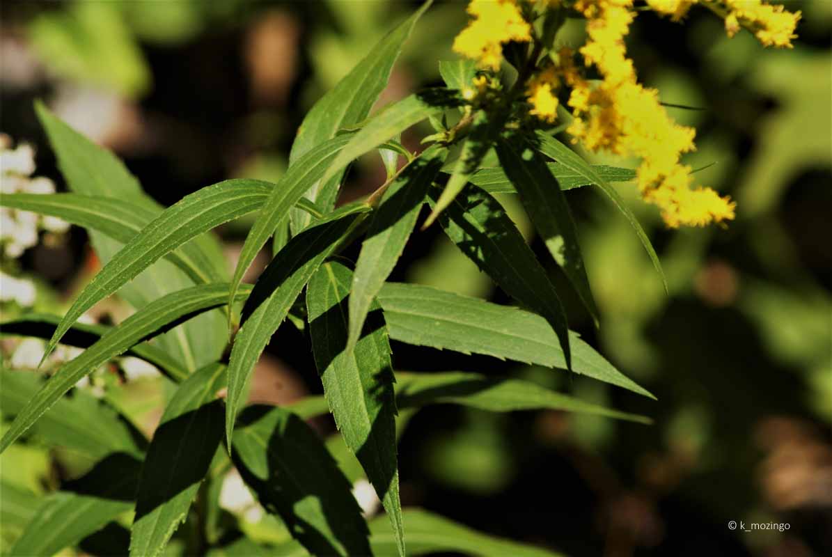 (Giant Goldenrod) The native Late Goldenrod is common in our area. It prefers full sunlight to light shade and wet to moist soil. Habitats include openings in floodplain woodlands, low partially shaded areas along streams and ponds, wet prairies, soggy thickets, fens and ditches. This vigorous perennial is 3-7' tall and unbranched, except at the apex where the flowering stalks occur. The alternate leaves are up to 3-5" long and 1/3–2/3" across, toothed, stalkless and narrowly lance shaped and tapering gradually towards the tip and base. The central stem terminates in a panicle of flowerheads up to 1' long and 1' across. Individual flowers on arching floral branchlets are a little less than ¼" across with 7-15 yellow ray florets and 5-11 yellow disk florets.