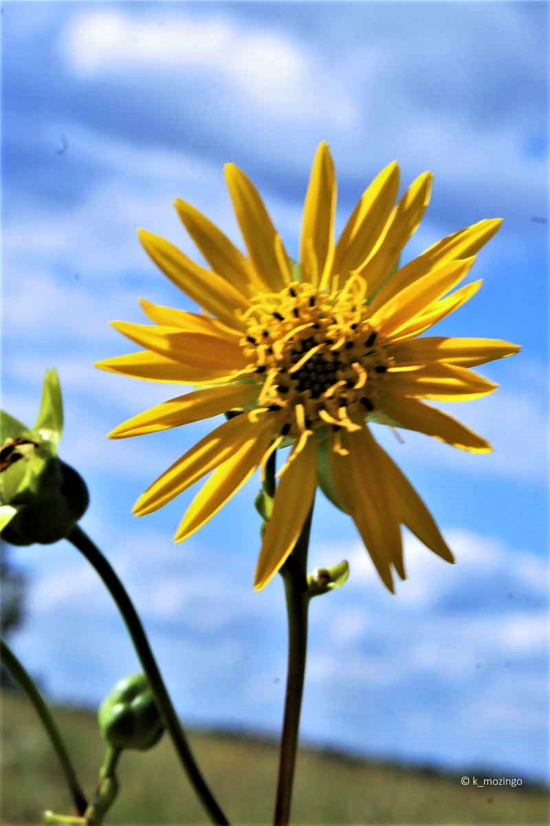 (Prairie Rosinweed) The native Prairie Dock is common in our area. It prefers full sun, a deep loamy soil, and moist to slightly dry conditions. Habitats include moist to dry black soil prairies, shrub prairies, hill prairies, savannas and prairie remnants along railroads. The flowering stalk of this perennial can be up 10' tall. At its base is a rosette of large basal leaves, up to 18" long and 12" wide, spade-shaped with a thick sandpapery texture. A naked flowering stalk emerges from the base and grows 3-10' tall dividing gracefully into a panicle of yellow composite flowers and spherical green buds. Each flower, 2-3" across, has 15-30 yellow ray florets surrounding numerous yellow disk florets.