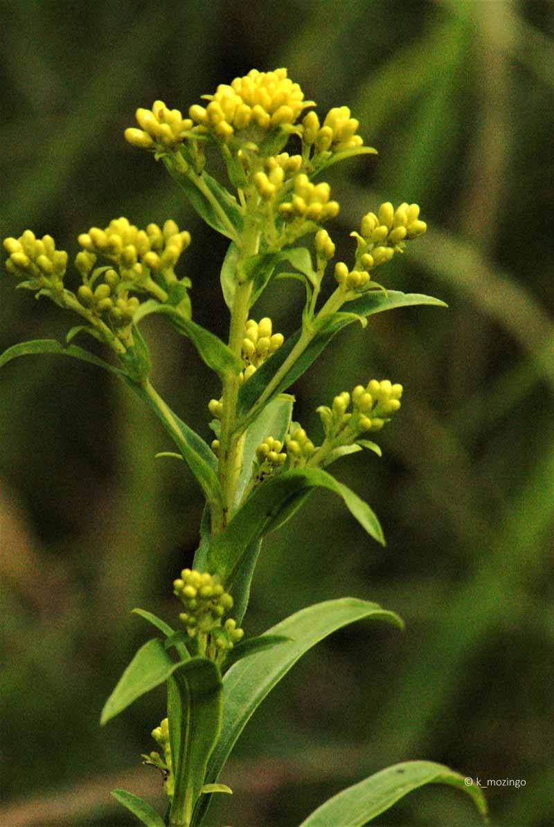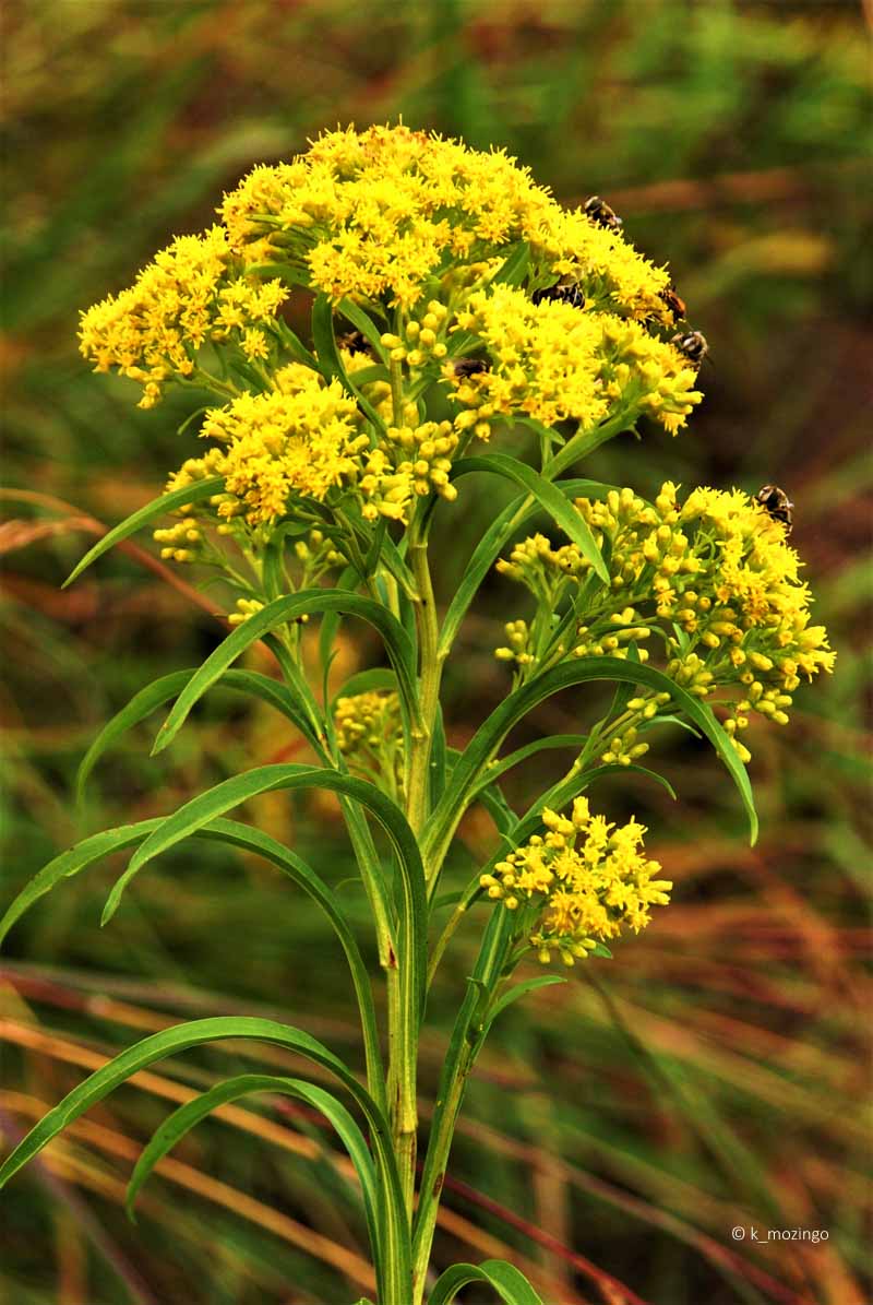 Riddell's Goldenrod The native Riddell's Goldenrod is uncommon. It prefers full sun and wet to moist calcareous soil. Habitats include moist prairies, gravelly hillside seeps, fens, and low areas along springs. This perennial is 1–3½' tall with alternate leaves that are lance-shaped and toothless. The lower leaves are up to 8" long and ¾" across on narrowly winged petioles up to 3" long. The upper leaves are up to 4" long and ½" across and often clasp the stem. The stem terminates in a dome-shaped flower panicle, about 2–7" across. The individual yellow flowers are about ¼" across with 4-9 yellow ray florets surrounding 5-10 disk florets.